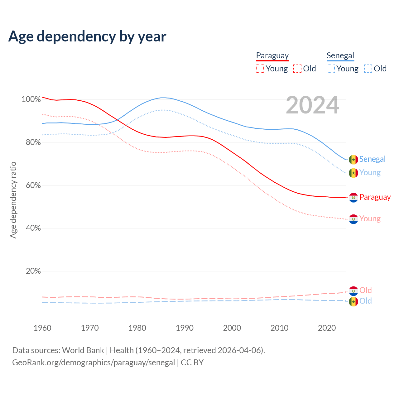 - Paraguay is ranked 118/196 by median age (oldest to youngest) vs 162/196 for Senegal.