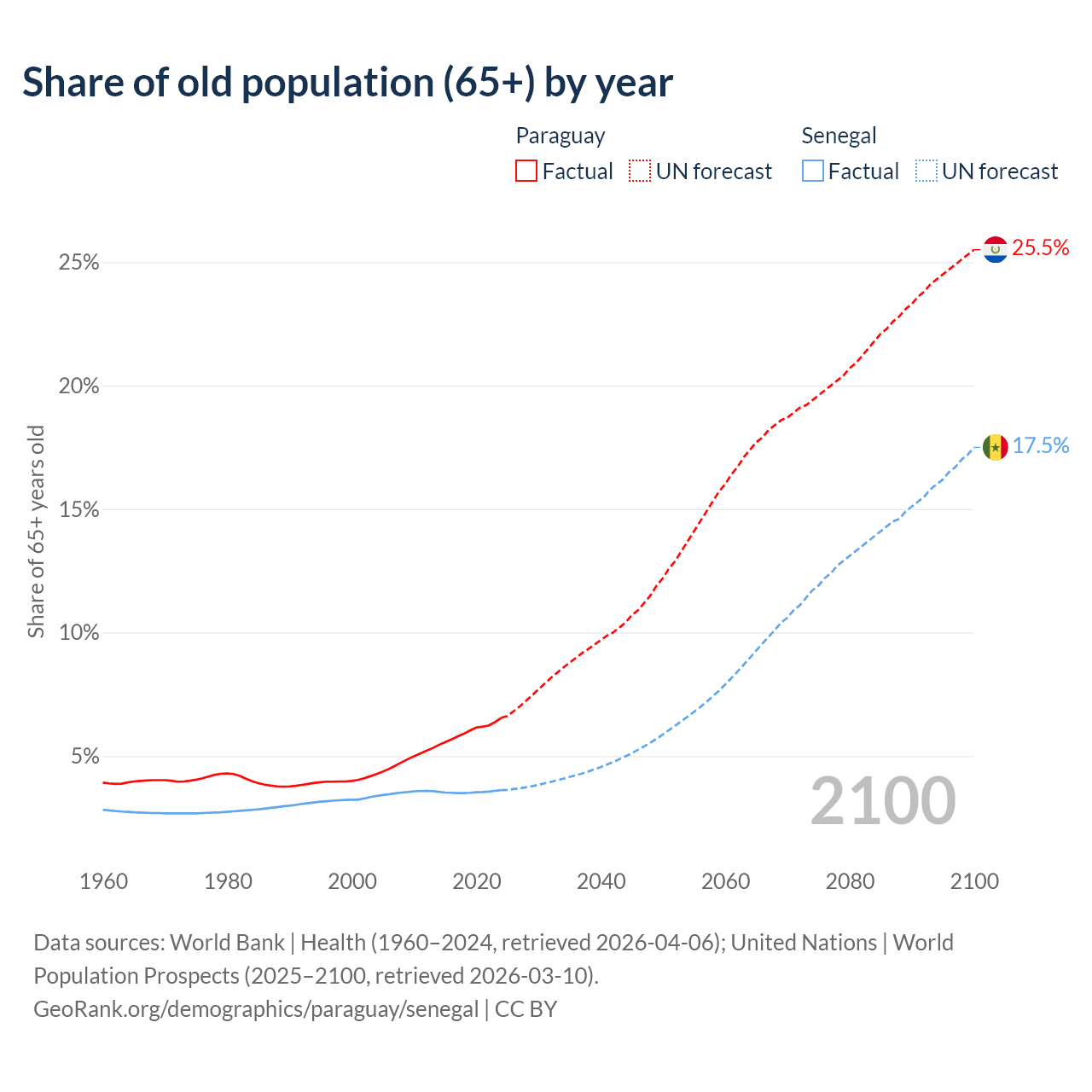 - The share of old-age demographic (65+) in Paraguay is 6.54% vs 3.62% in Senegal.