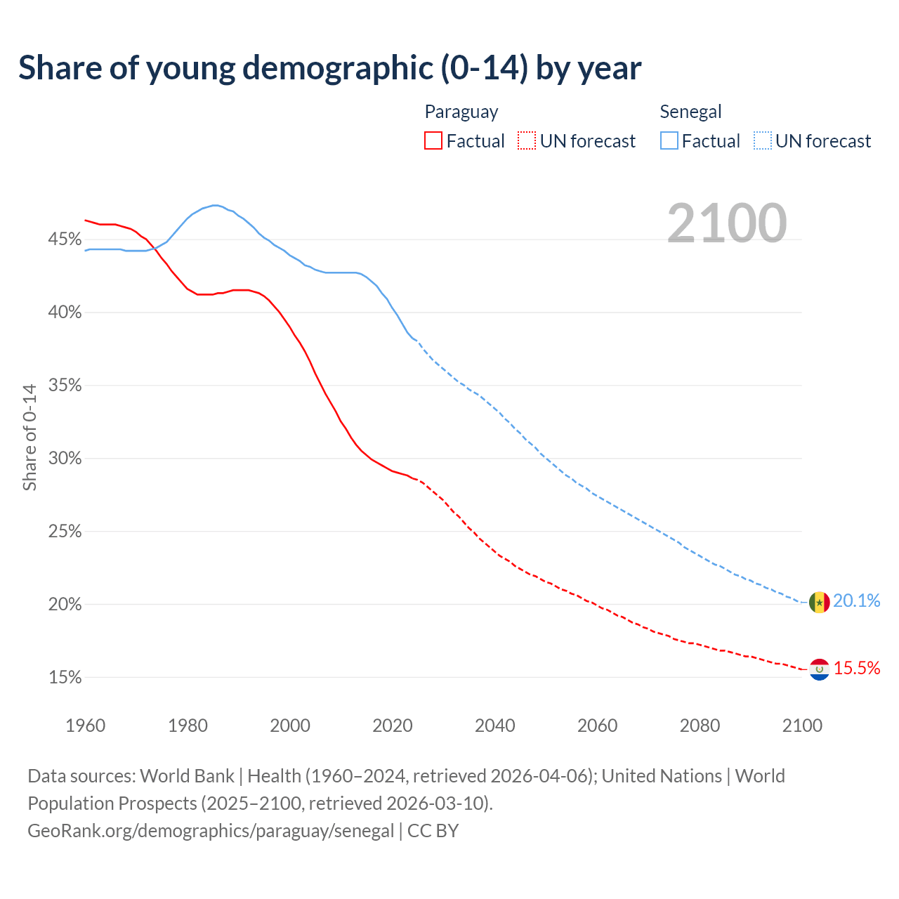 - The share of young demographic (0-15 years old) in Paraguay is 28.6% vs 38.2% in Senegal.