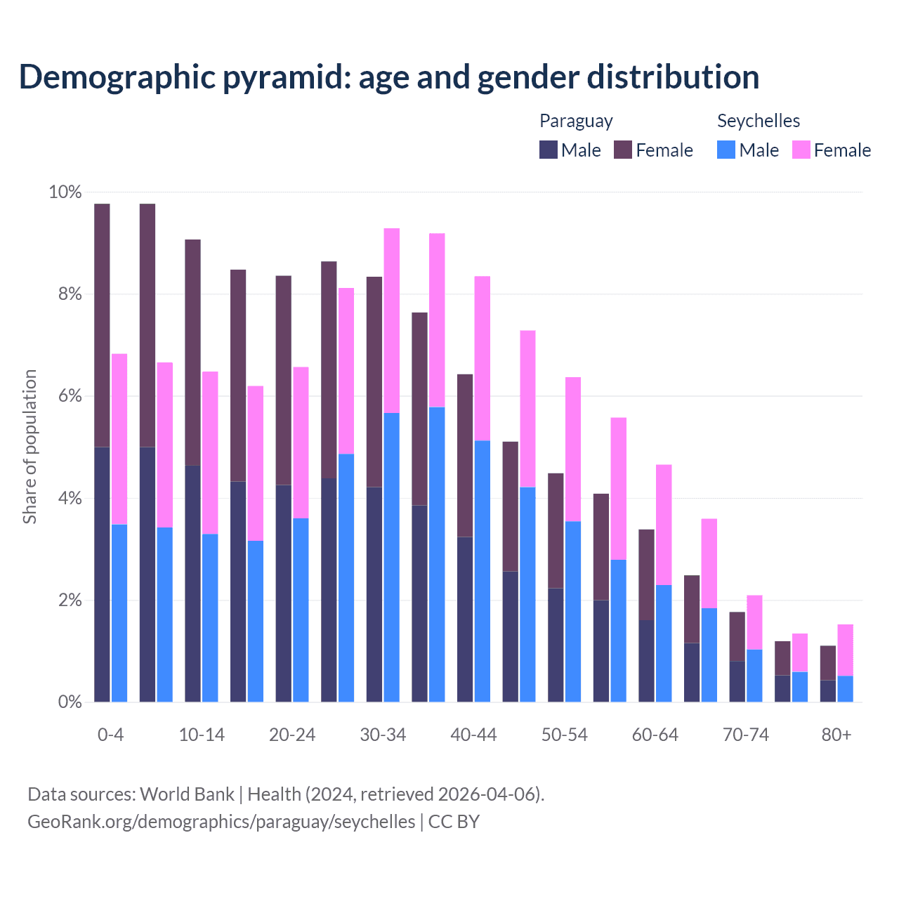 - The share of old-age demographic (65+) in Paraguay is 6.54% vs 8.54% in the Seychelles.