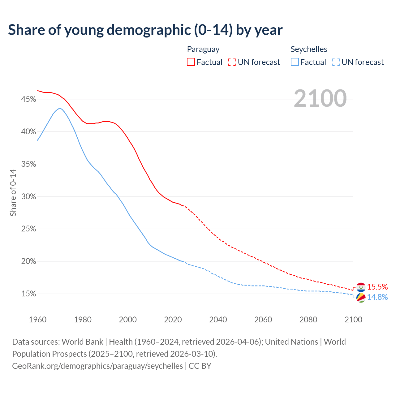 - The share of young demographic (0-15 years old) in Paraguay is 28.6% vs 20% in the Seychelles.