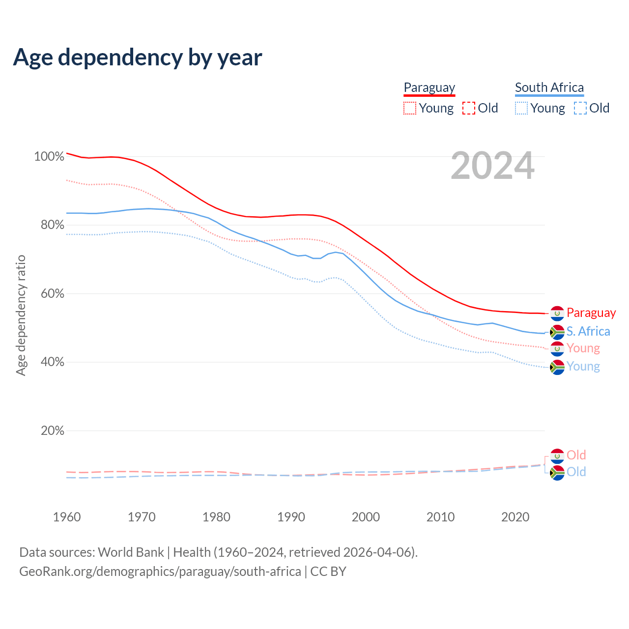 Data sources: World Bank | Health (1960–2024, retrieved 2026-04-06); U.S. Census Bureau (1960–2024, retrieved 2026-02-08).