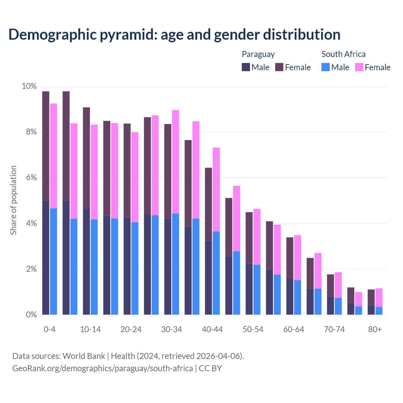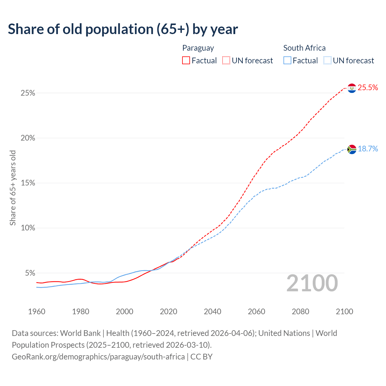 The share of older people aged 65 and over is 6.54% in Paraguay and 6.69% in South Africa. Life expectancy in Paraguay compared to South Africa .