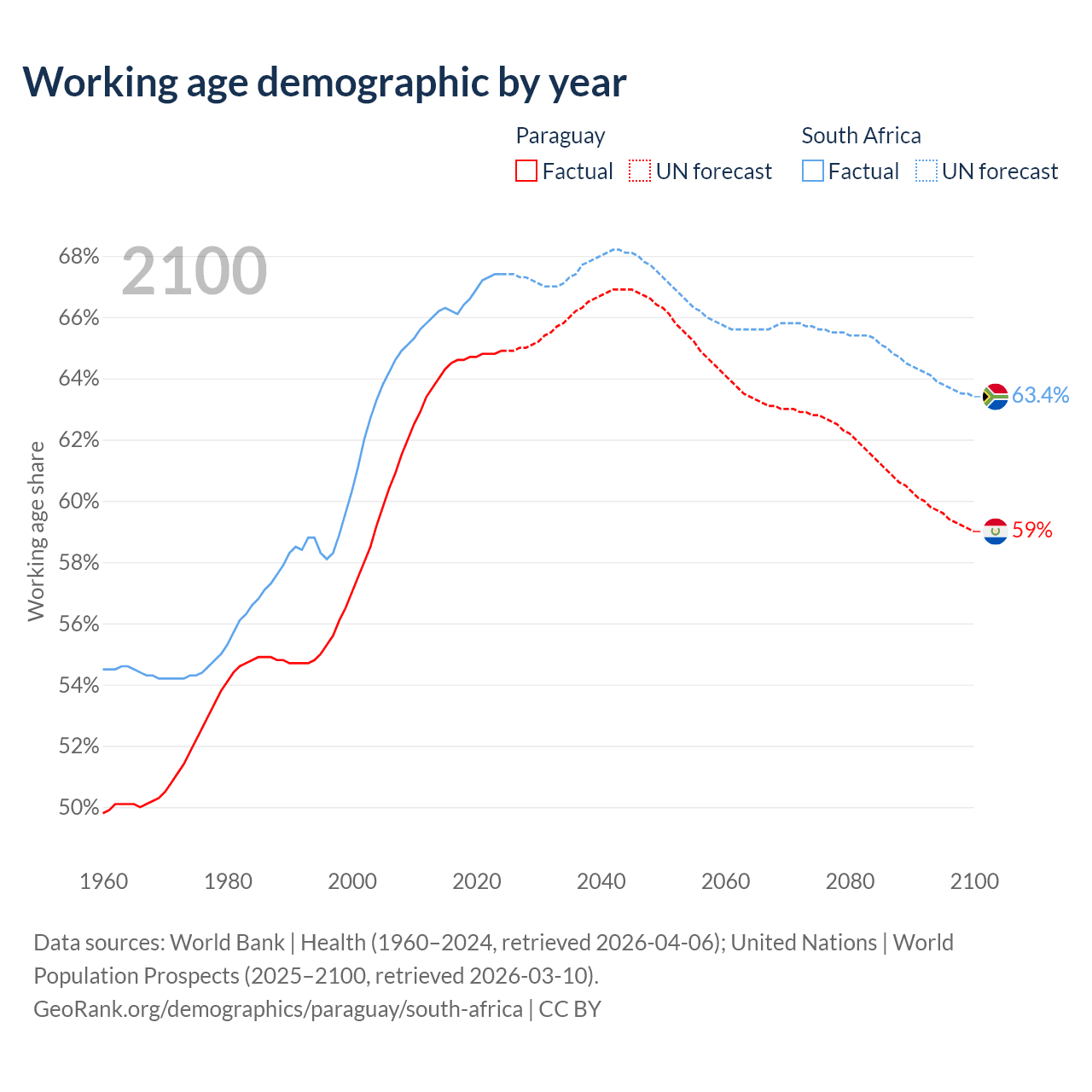 Median age Paraguay vs South Africa, 1960-2100