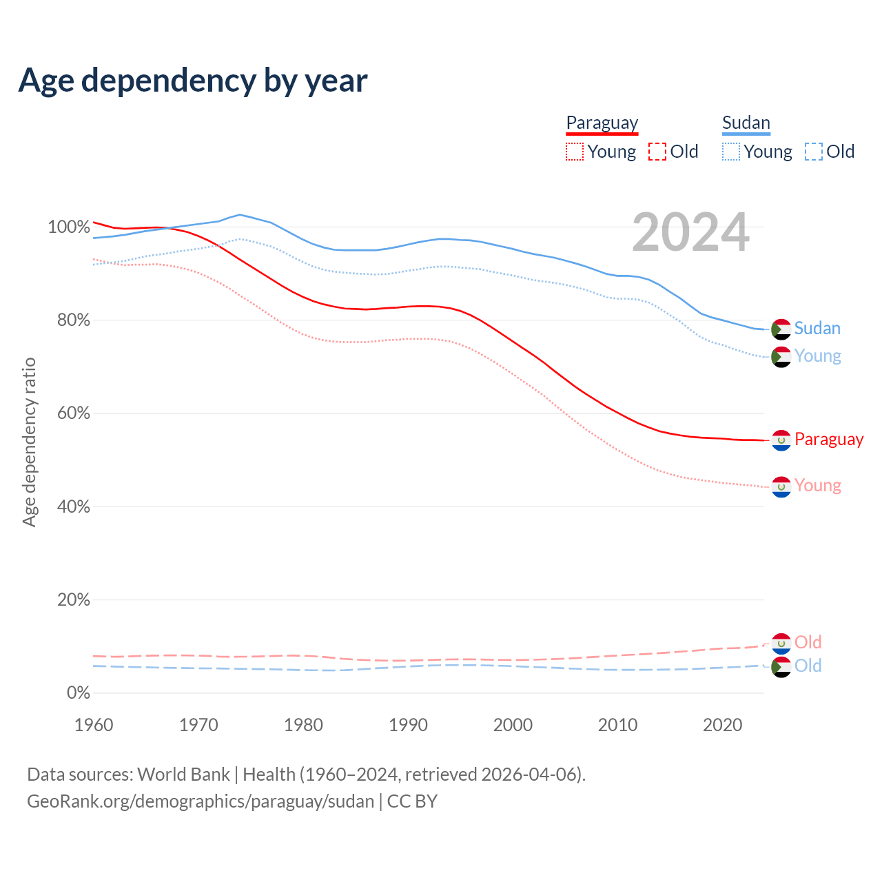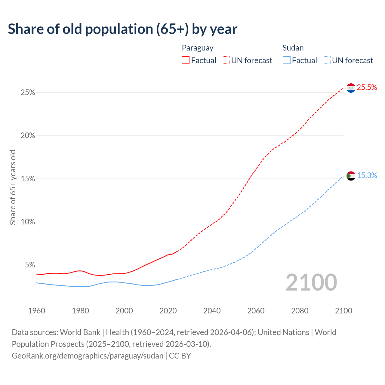 - The share of old-age demographic (65+) in Paraguay is 6.54% vs 3.3% in Sudan.