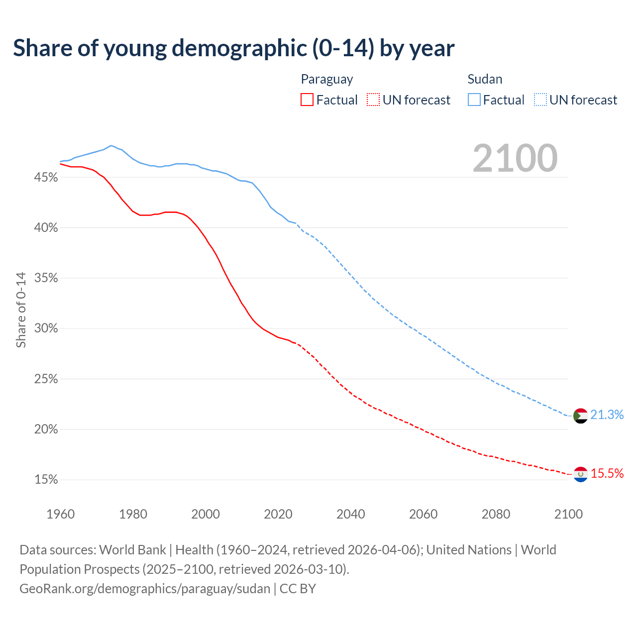 - The share of young demographic (0-15 years old) in Paraguay is 28.6% vs 40.5% in Sudan.