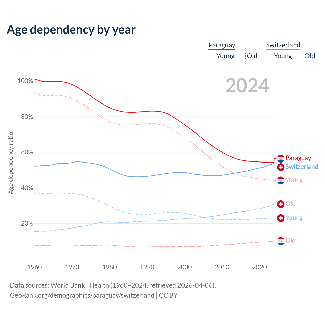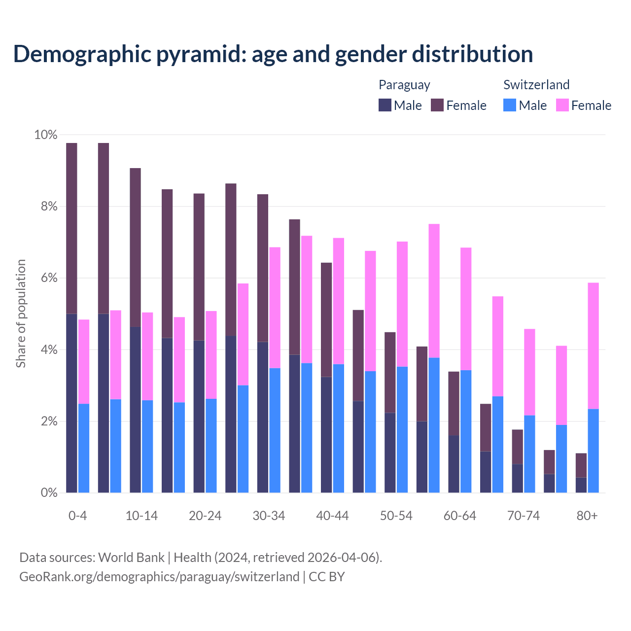 - Paraguay is ranked 118/196 by median age (oldest to youngest) vs 24/196 for Switzerland.
