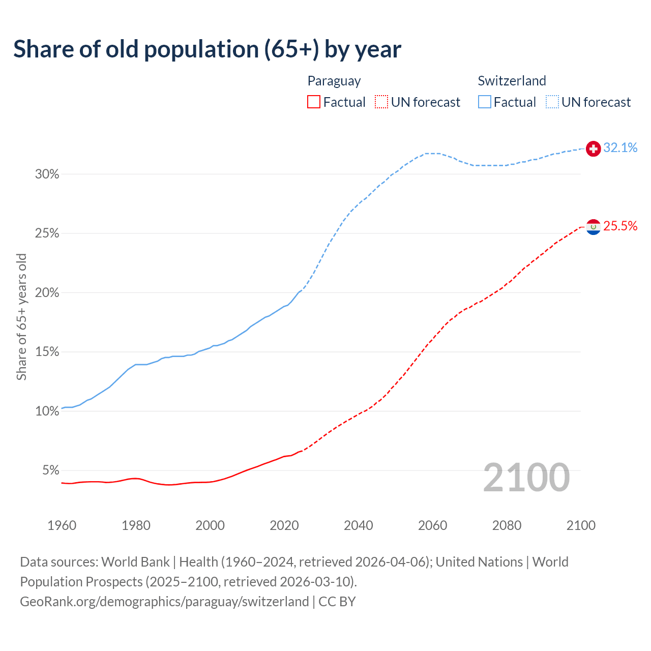 The share of older people aged 65 and over is 6.54% in Paraguay and 20% in Switzerland. Life expectancy in Paraguay compared to Switzerland .