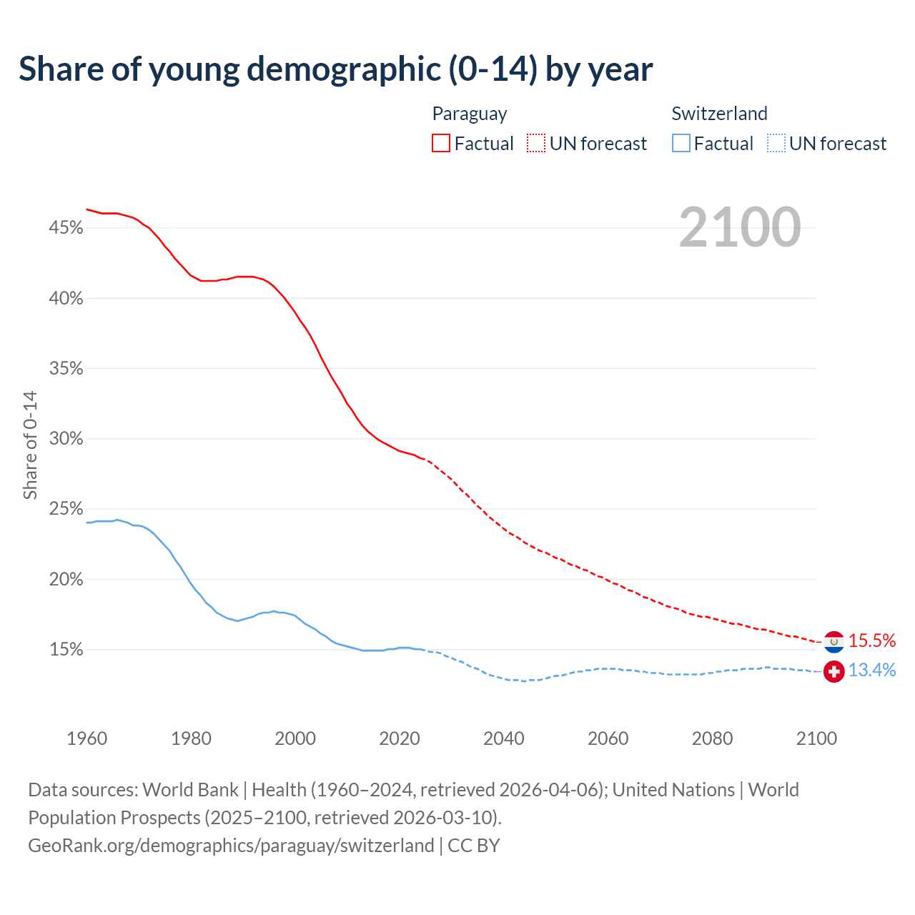 - The share of young demographic (0-15 years old) in Paraguay is 28.6% vs 15% in Switzerland.