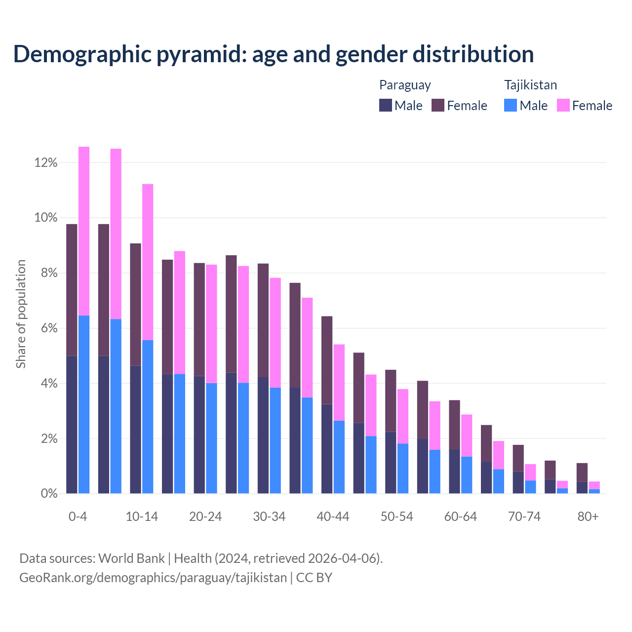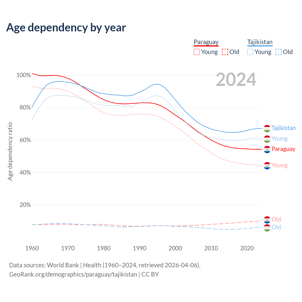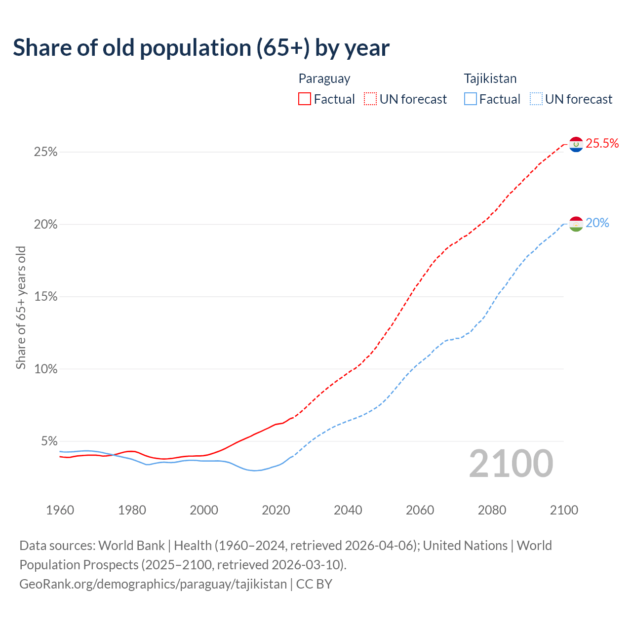 - The share of old-age demographic (65+) in Paraguay is 6.54% vs 3.85% in Tajikistan.