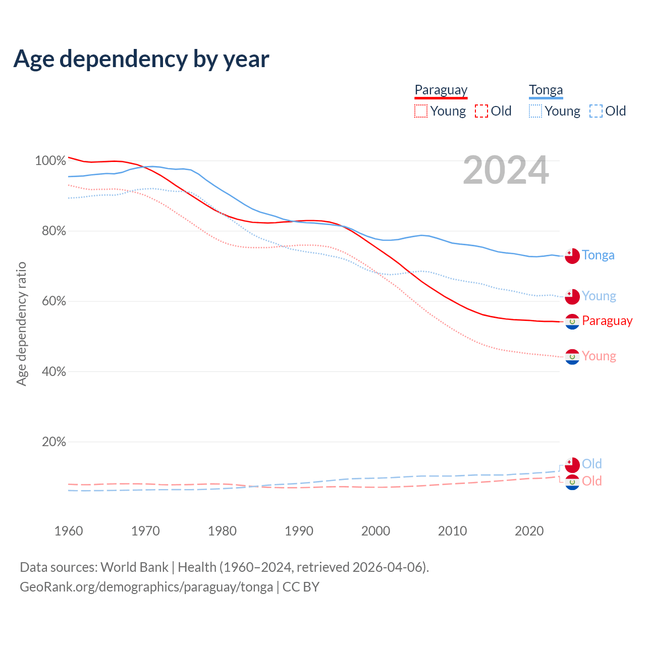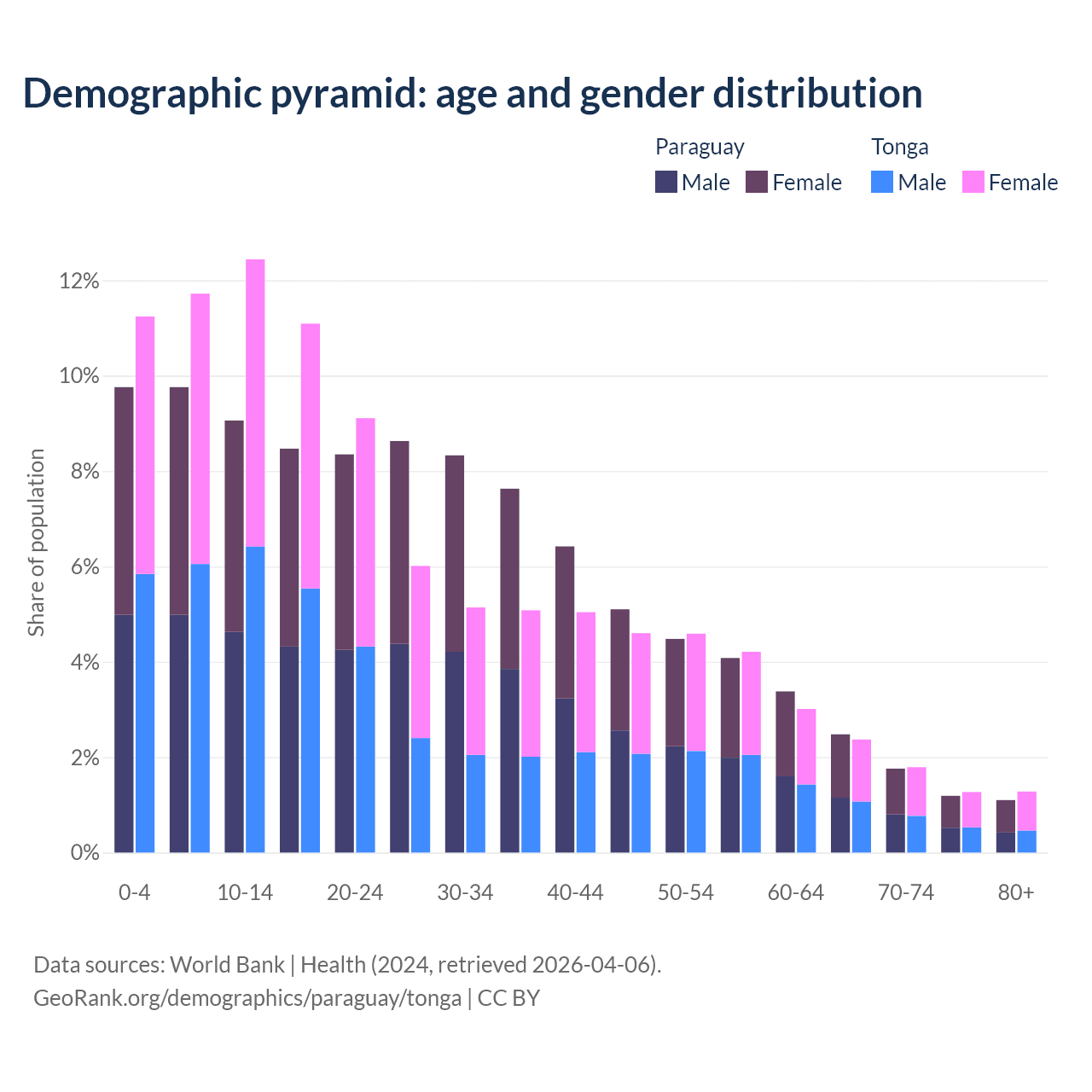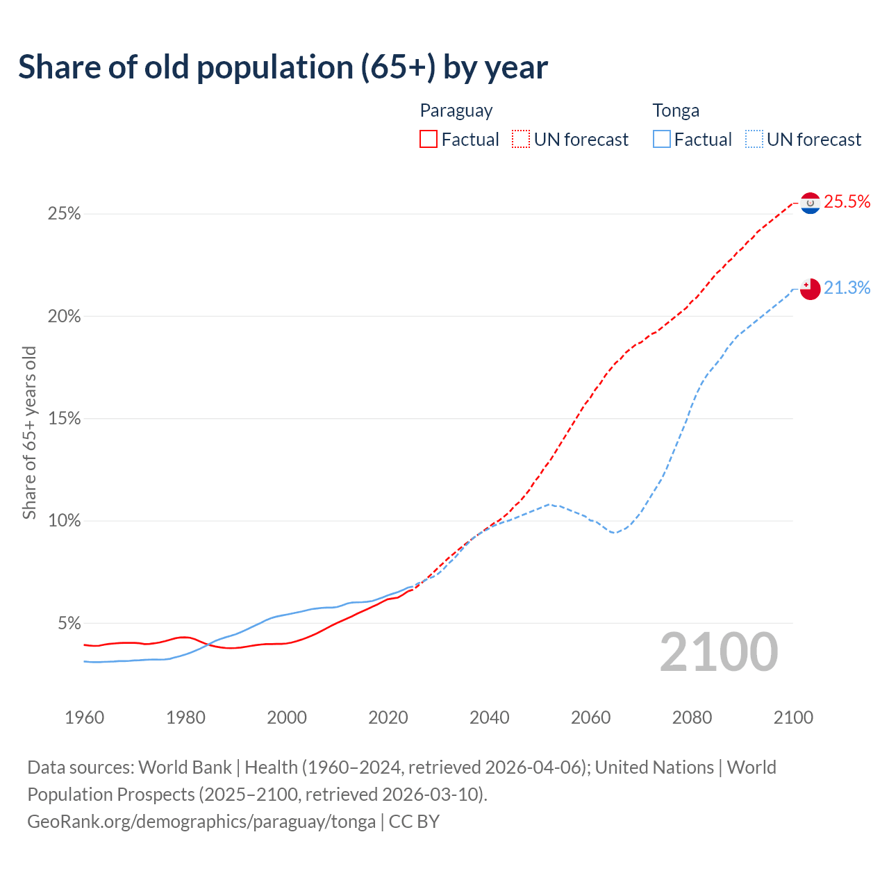 - The share of old-age demographic (65+) in Paraguay is 6.54% vs 6.72% in Tonga.