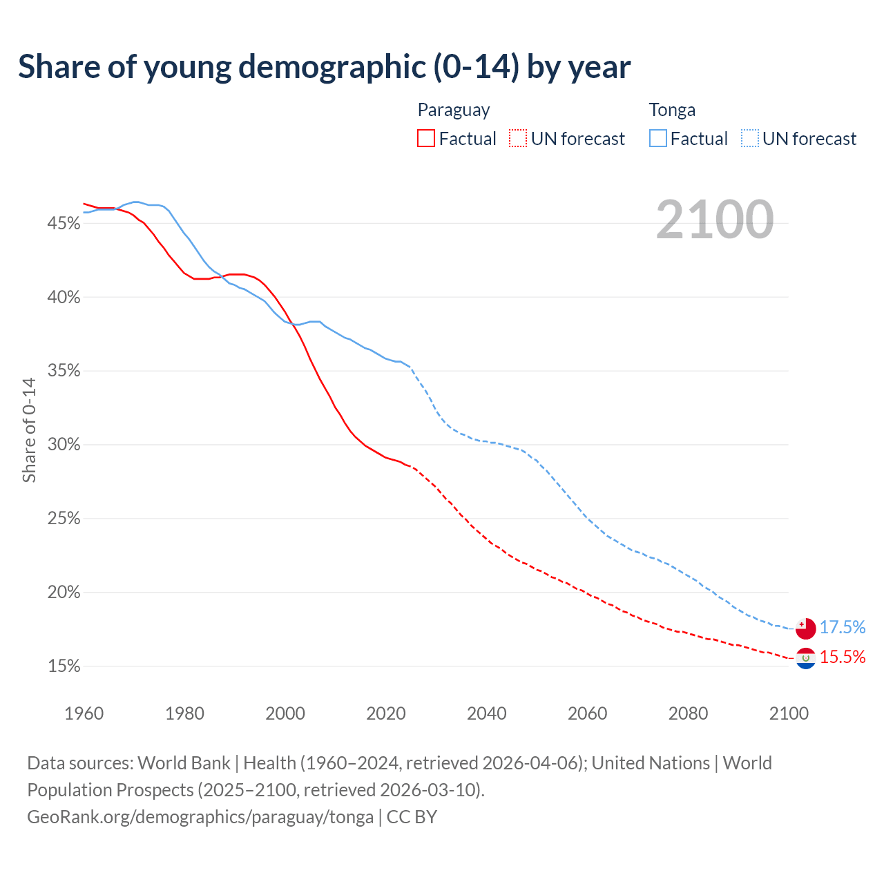 - The share of young demographic (0-15 years old) in Paraguay is 28.6% vs 35.4% in Tonga.