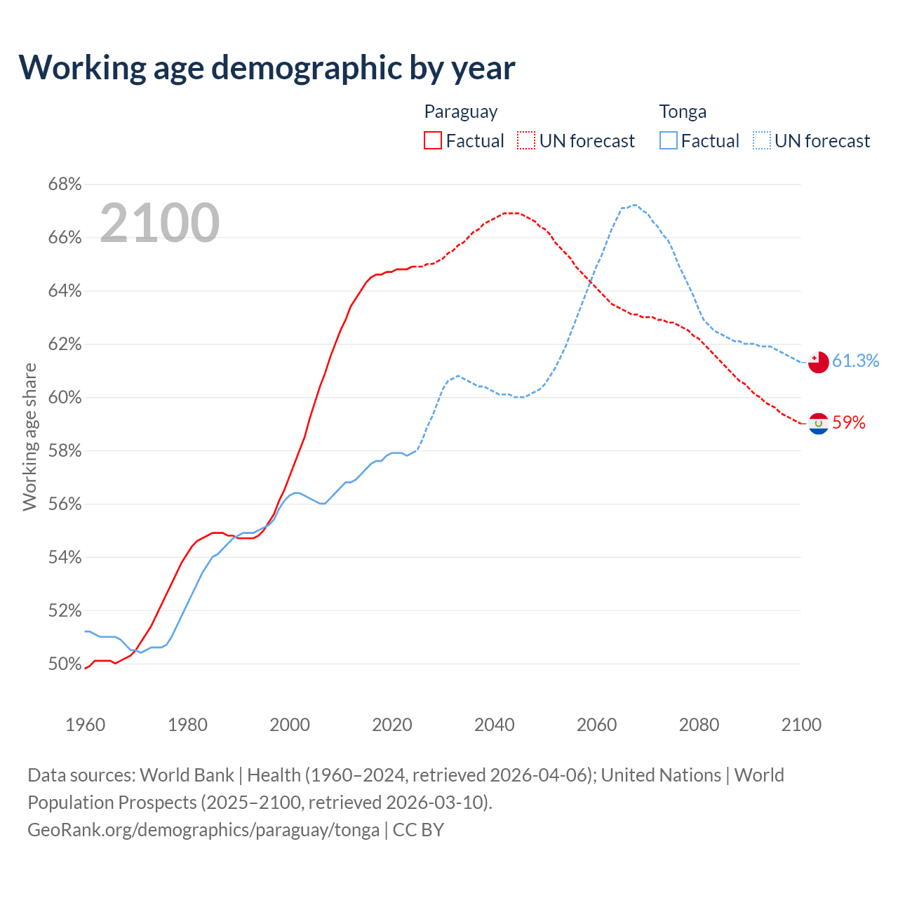 - Paraguay has 4.62M working age adults (aged 15-64) vs 59.8K in Tonga.