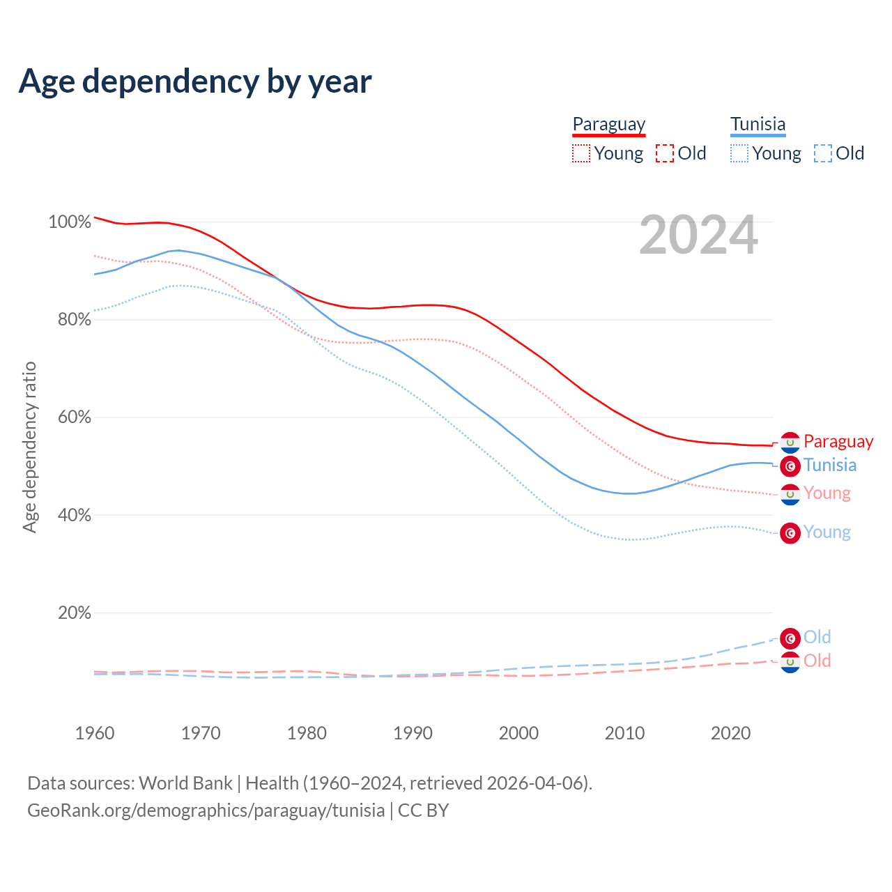 - The share of old-age demographic (65+) in Paraguay is 6.54% vs 9.53% in Tunisia.