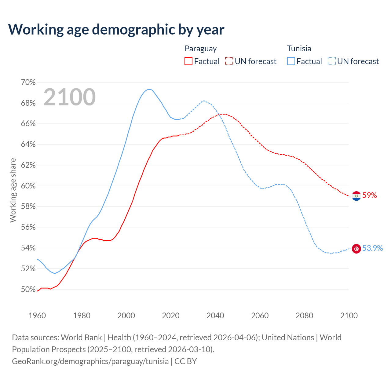 Median age Paraguay vs Tunisia, 1960-2100