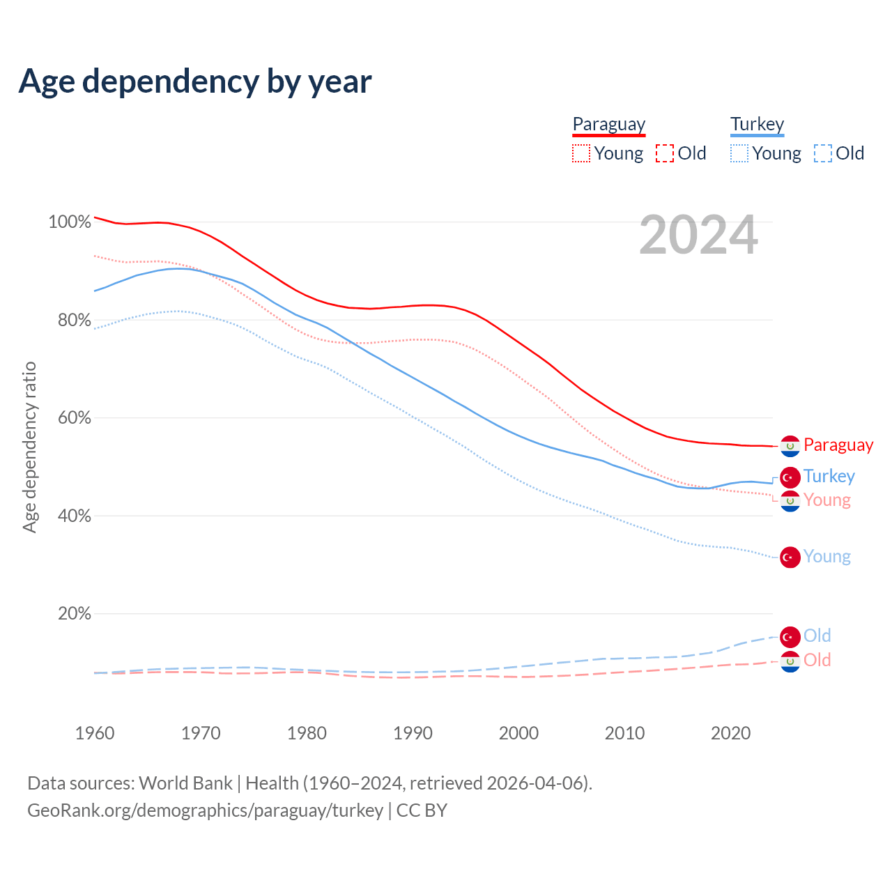 - Paraguay is ranked 118/196 by median age (oldest to youngest) vs 83/196 for Turkey.