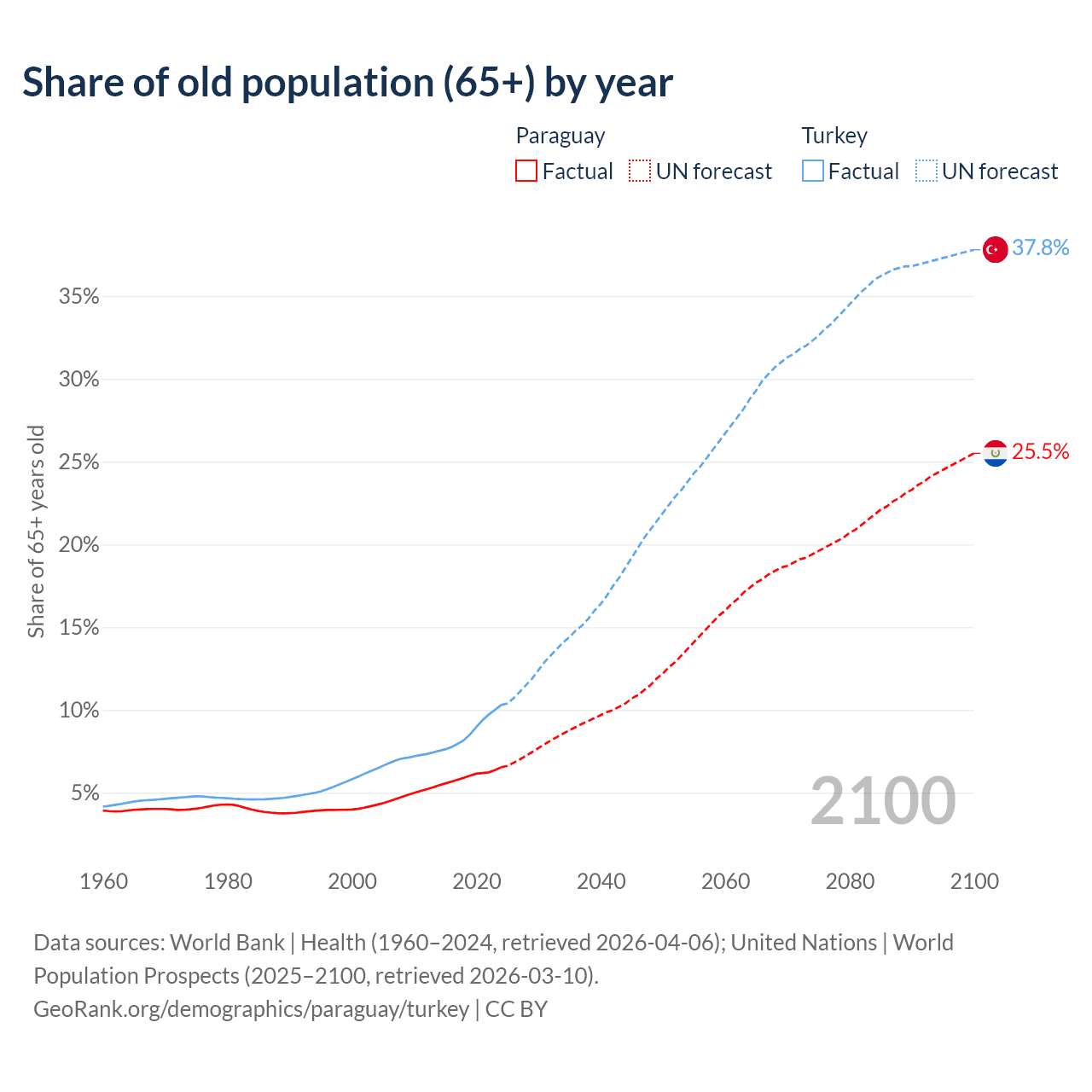 The share of older people aged 65 and over is 6.54% in Paraguay and 10.3% in Turkey. Life expectancy in Paraguay compared to Turkey .