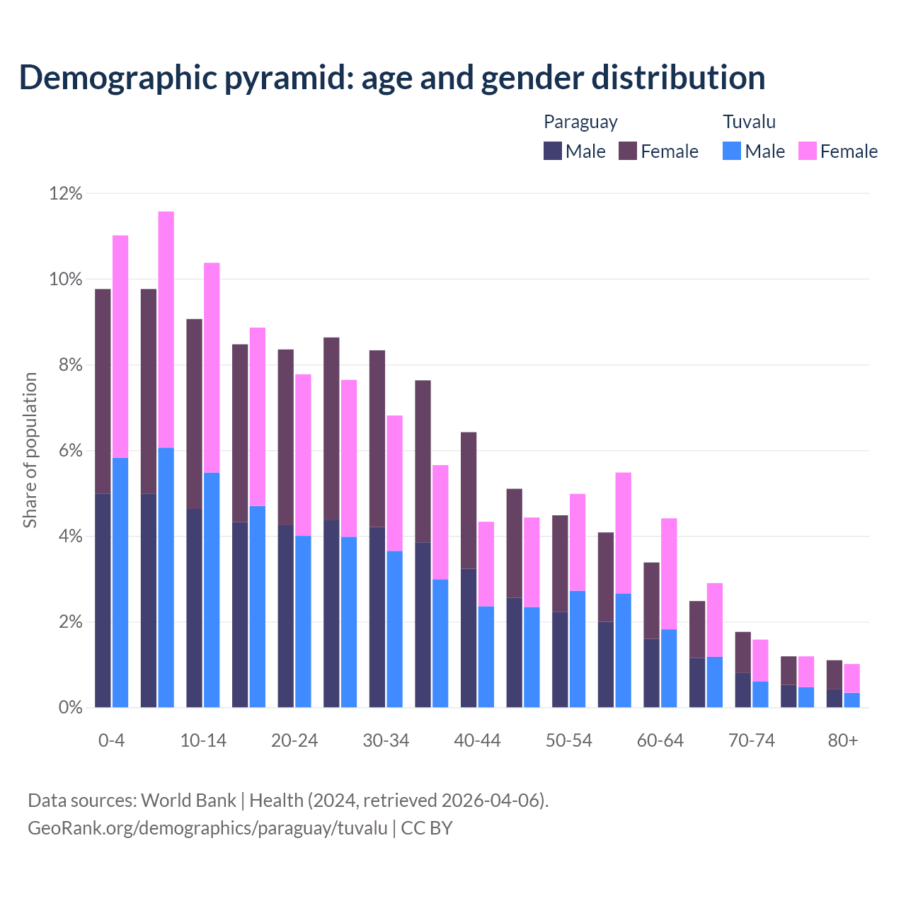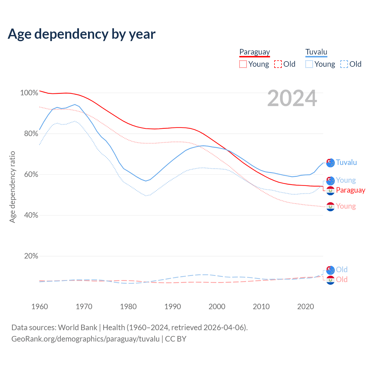 - The share of old-age demographic (65+) in Paraguay is 6.54% vs 6.67% in Tuvalu.