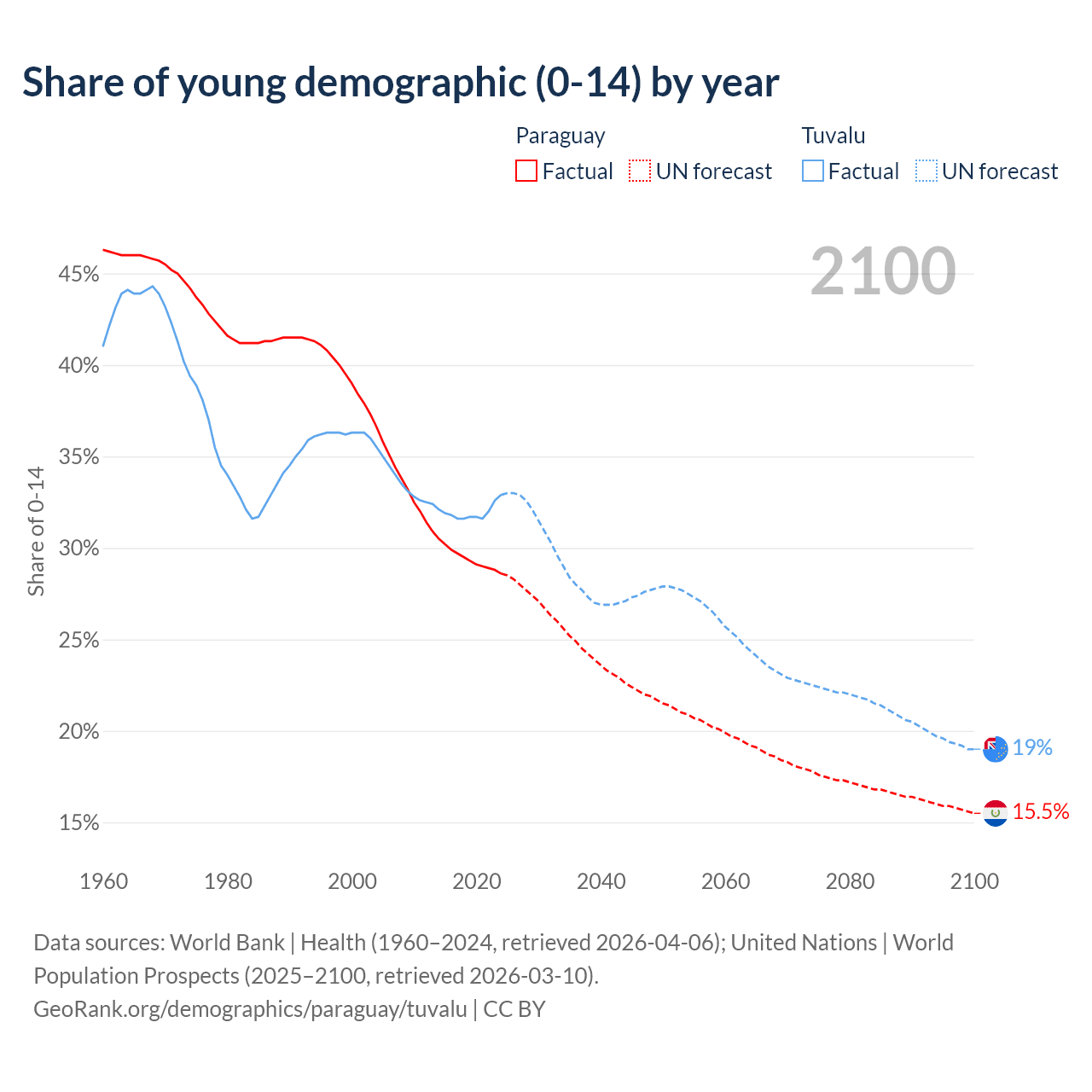 - The share of young demographic (0-15 years old) in Paraguay is 28.6% vs 32.9% in Tuvalu.