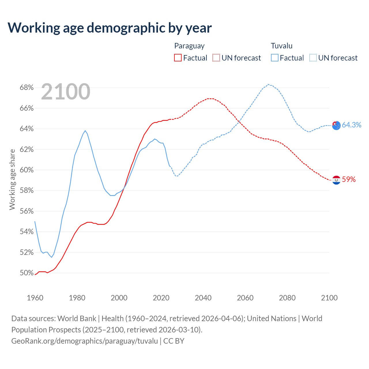 - Paraguay has 4.62M working age adults (aged 15-64) vs 5.64K in Tuvalu.
