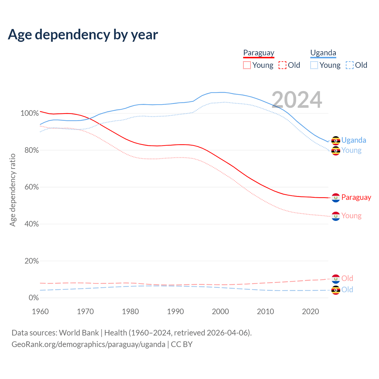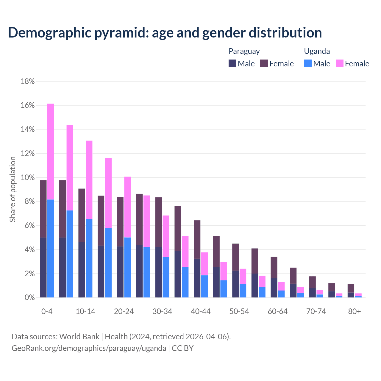 - Paraguay is ranked 118/196 by median age (oldest to youngest) vs 187/196 for Uganda.