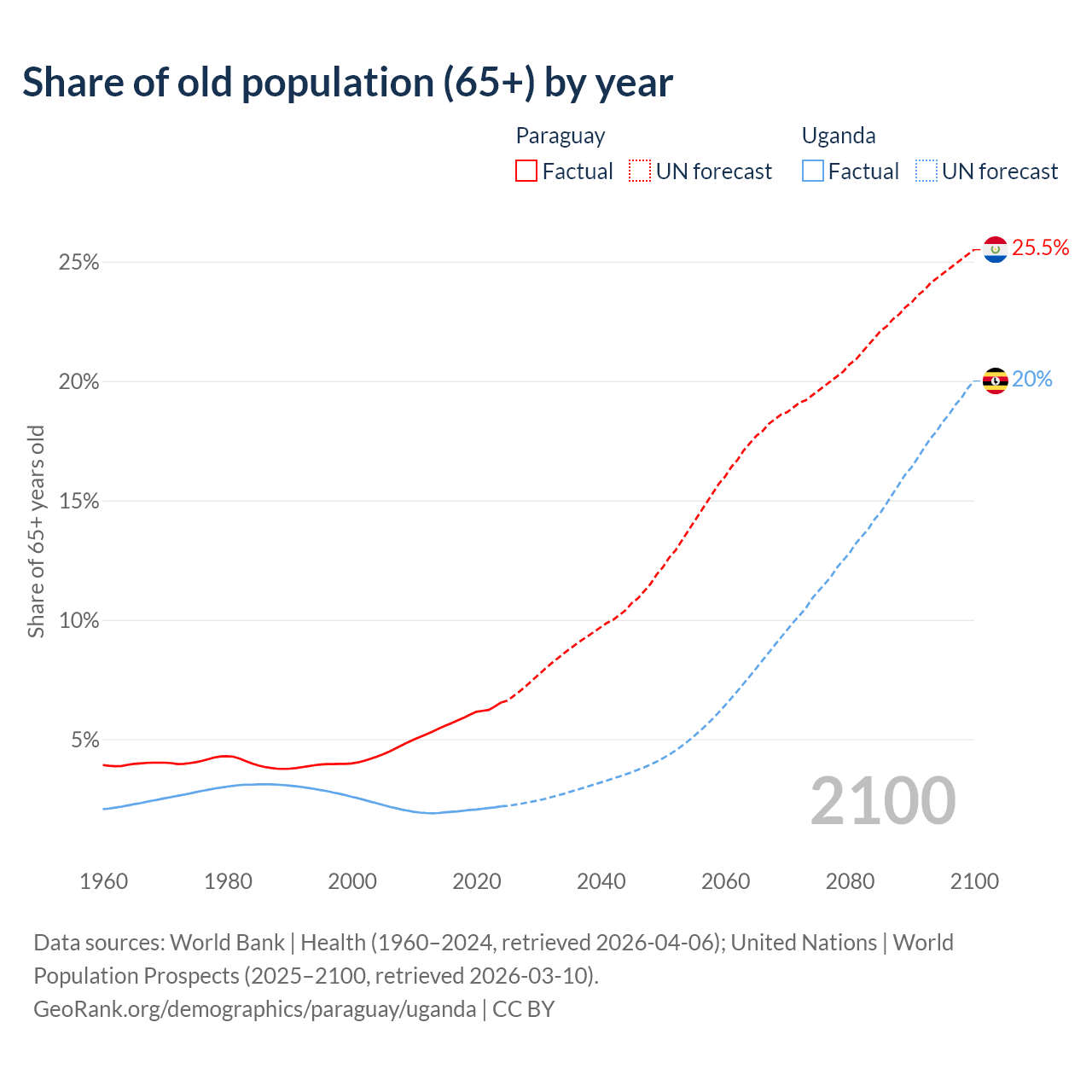 - The share of old-age demographic (65+) in Paraguay is 6.54% vs 2.19% in Uganda.