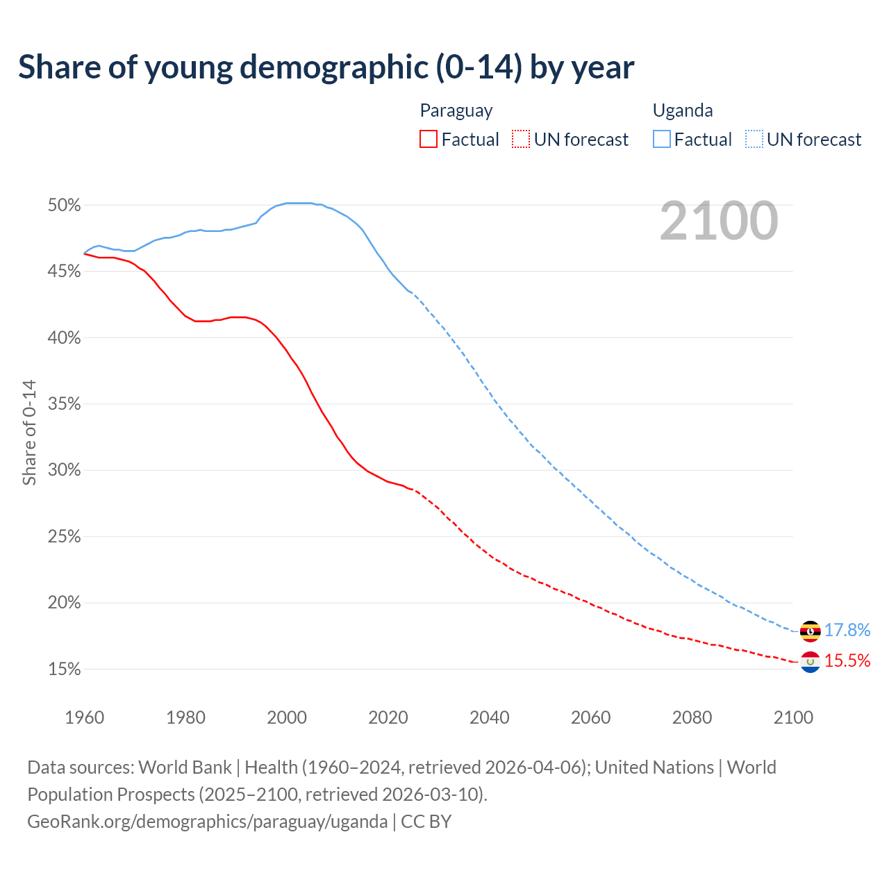 - The share of young demographic (0-15 years old) in Paraguay is 28.6% vs 43.5% in Uganda.