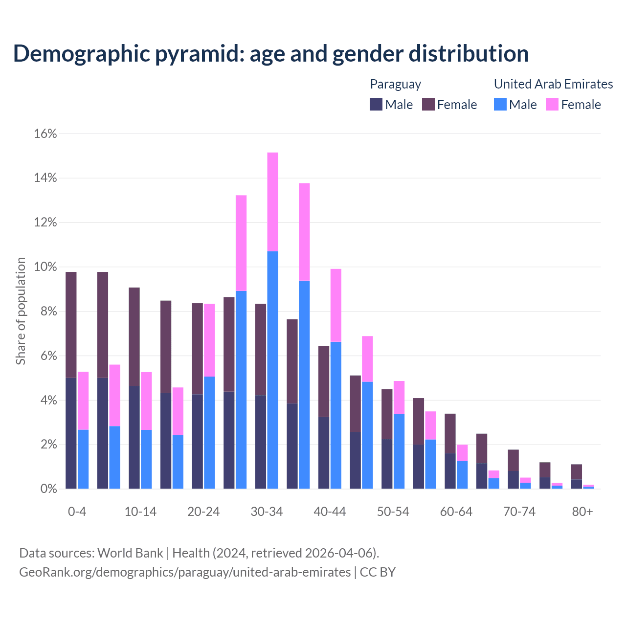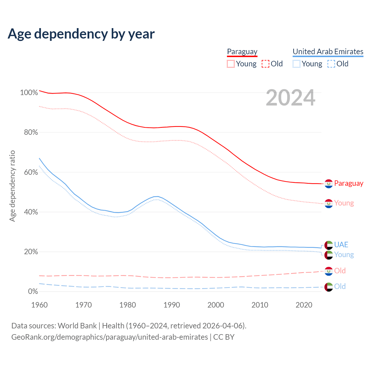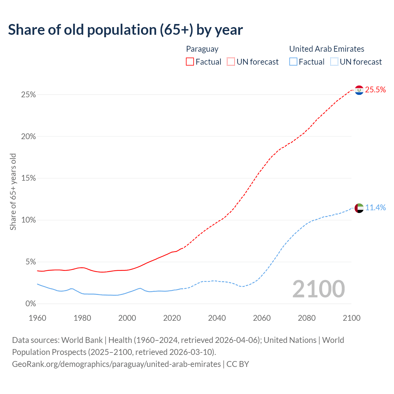 - The share of old-age demographic (65+) in Paraguay is 6.54% vs 1.77% in the United Arab Emirates.