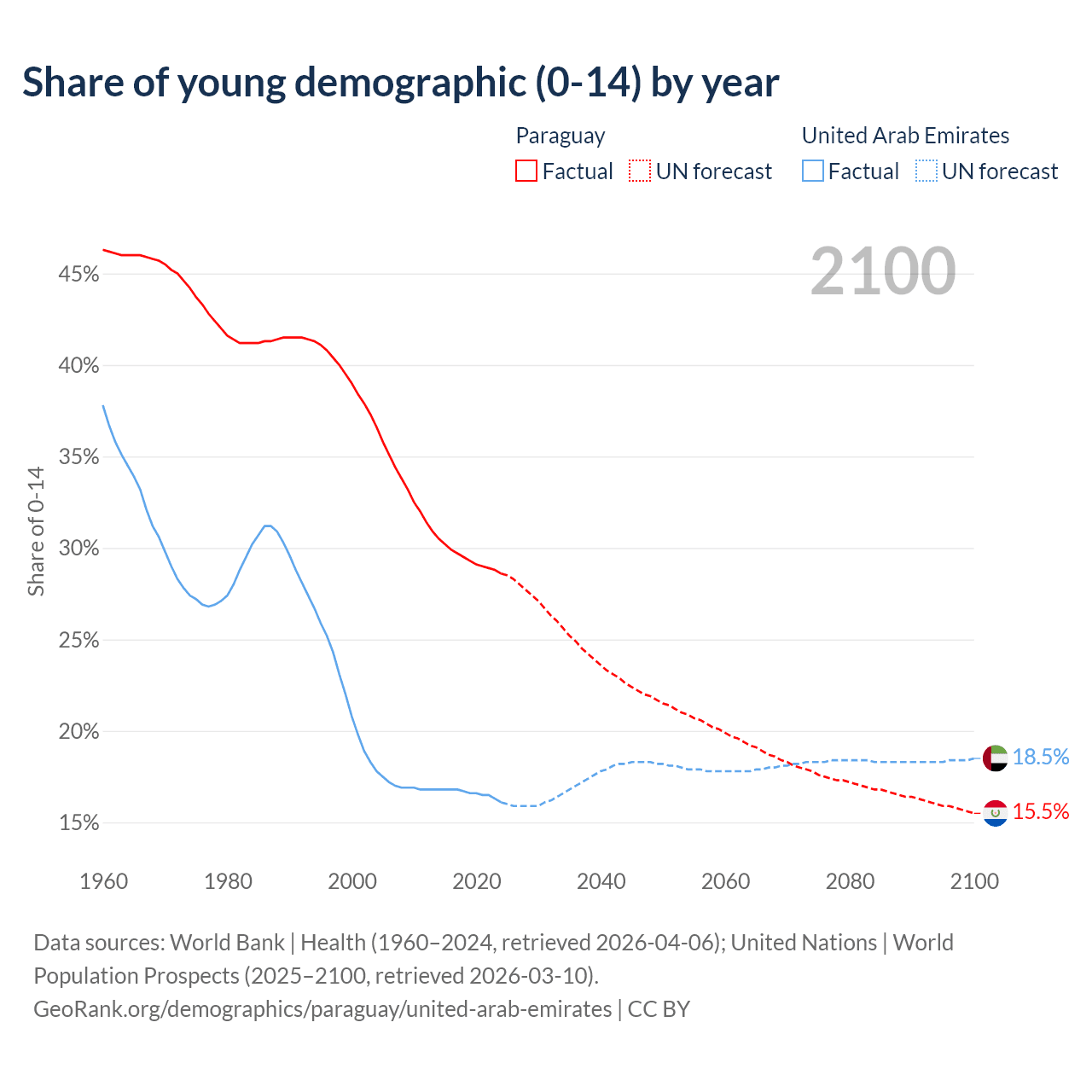 - The share of young demographic (0-15 years old) in Paraguay is 28.6% vs 16.1% in the United Arab Emirates.