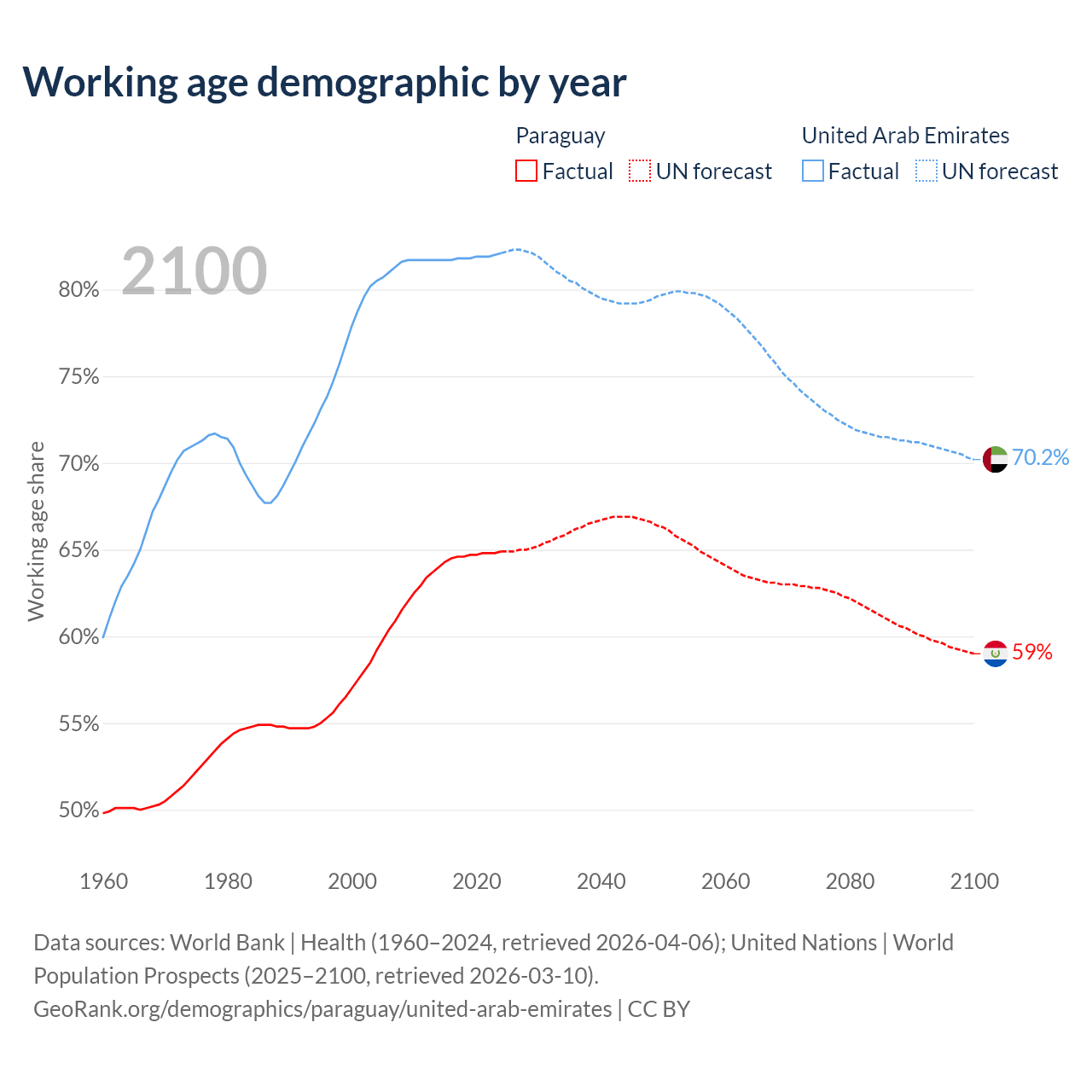 The share of older people aged 65 and over is 6.54% in Paraguay and 1.77% in the United Arab Emirates. Life expectancy in Paraguay compared to the United Arab Emirates .