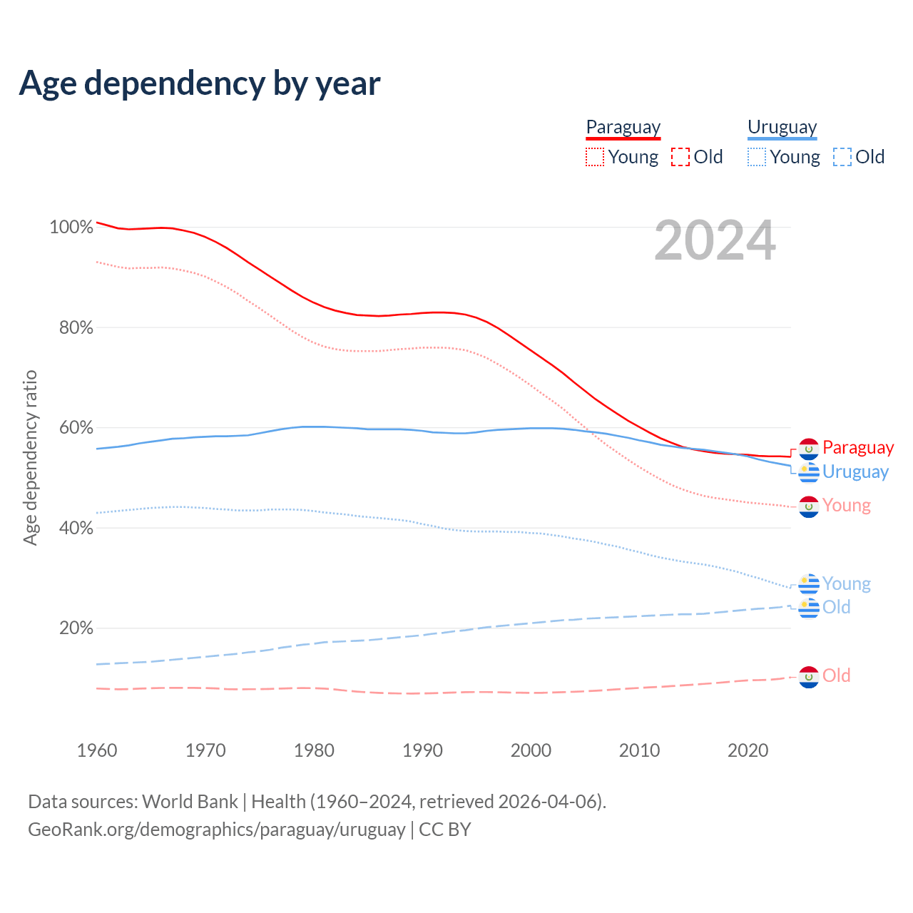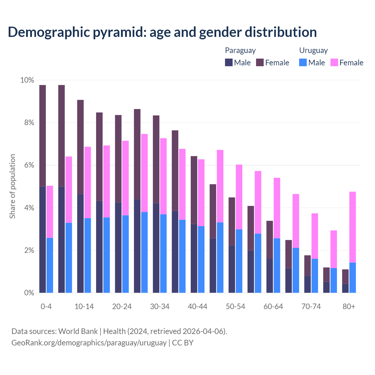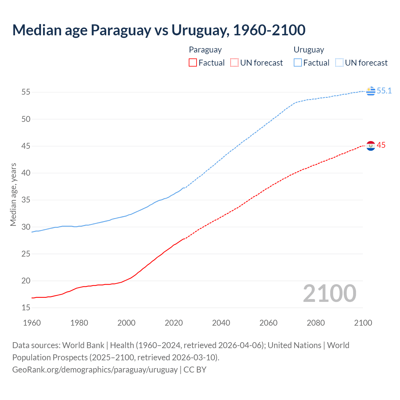 - Paraguay is ranked 118/196 by median age (oldest to youngest) vs 63/196 for Uruguay.