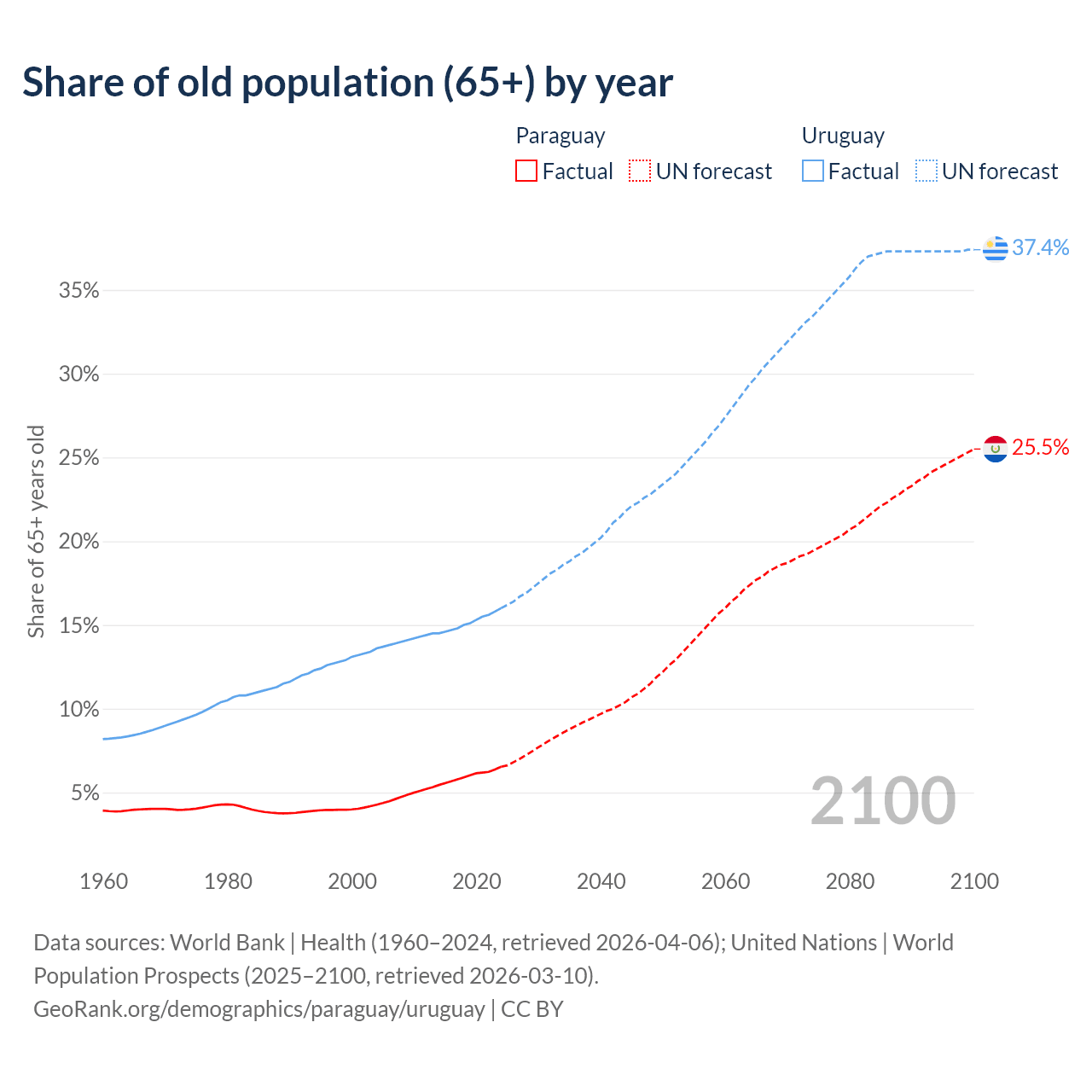 The share of older people aged 65 and over is 6.54% in Paraguay and 16% in Uruguay. Life expectancy in Paraguay compared to Uruguay .