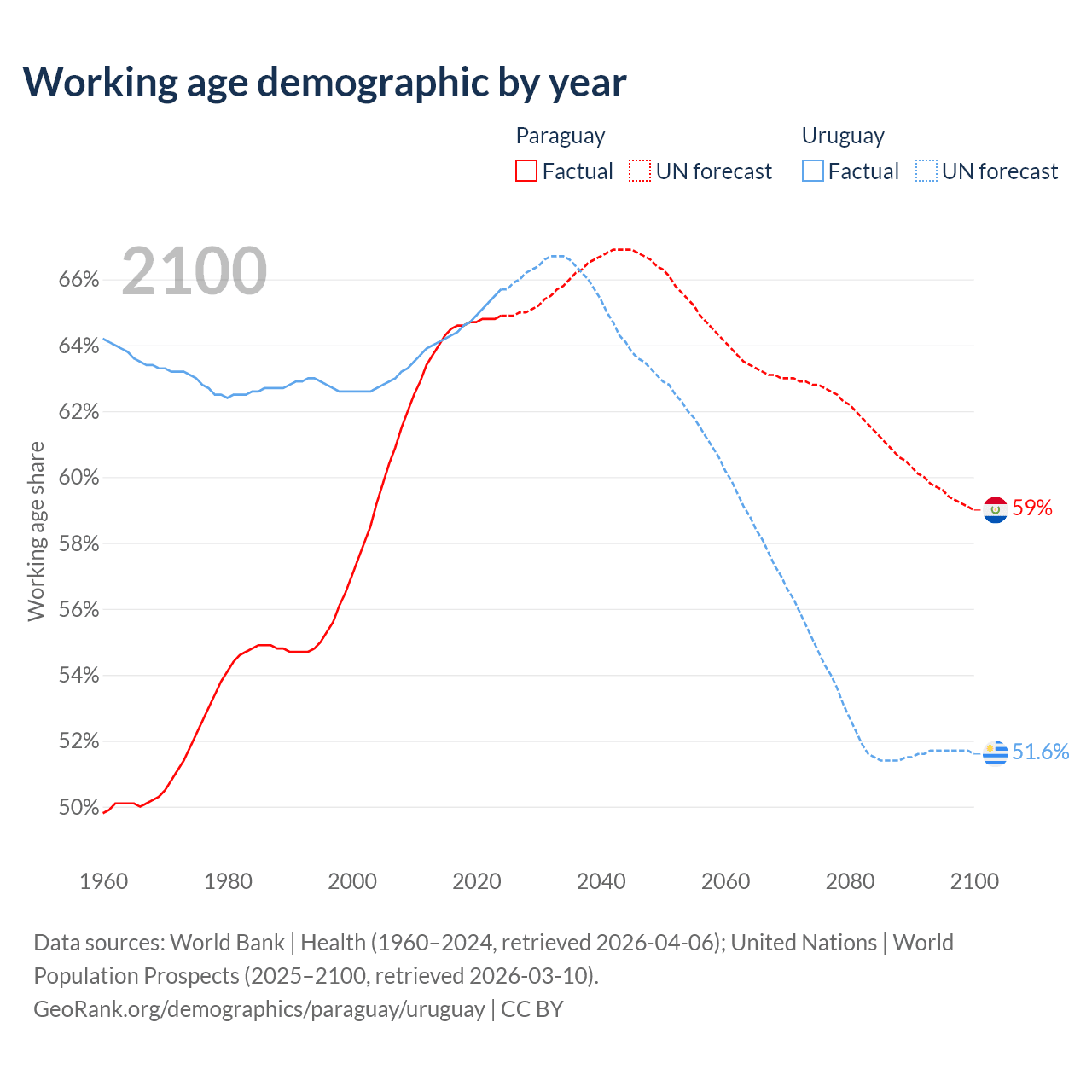 - Paraguay has 4.62M working age adults (aged 15-64) vs 2.22M in Uruguay.