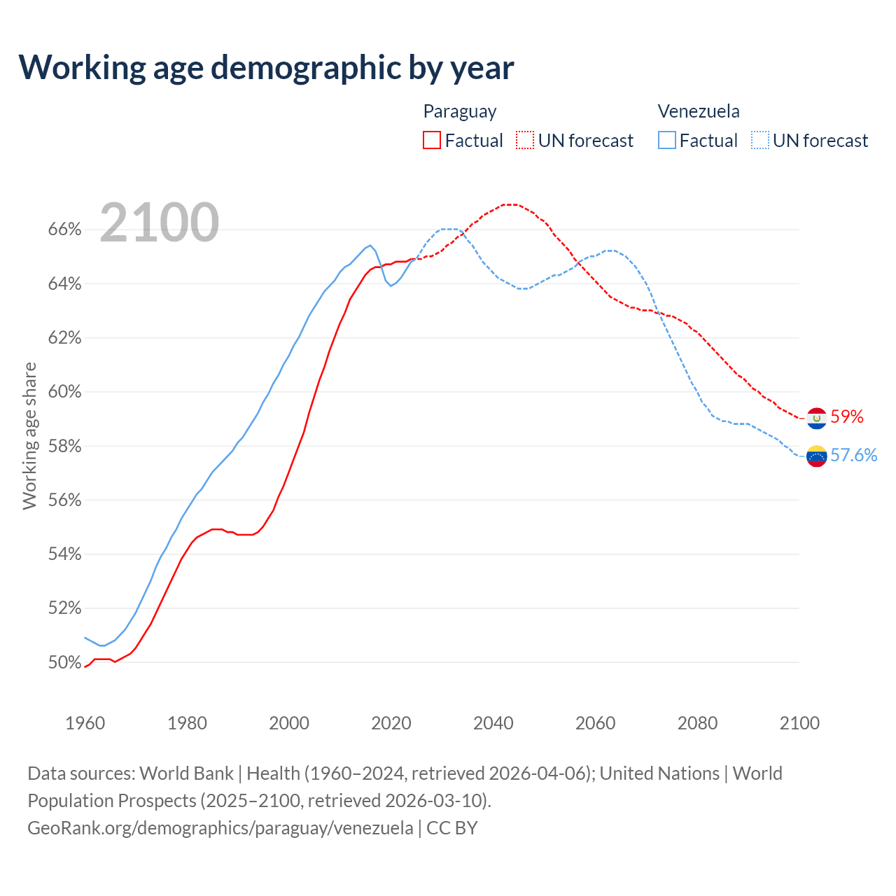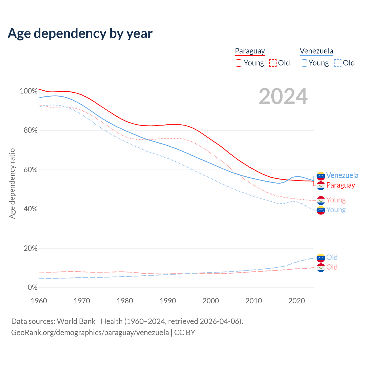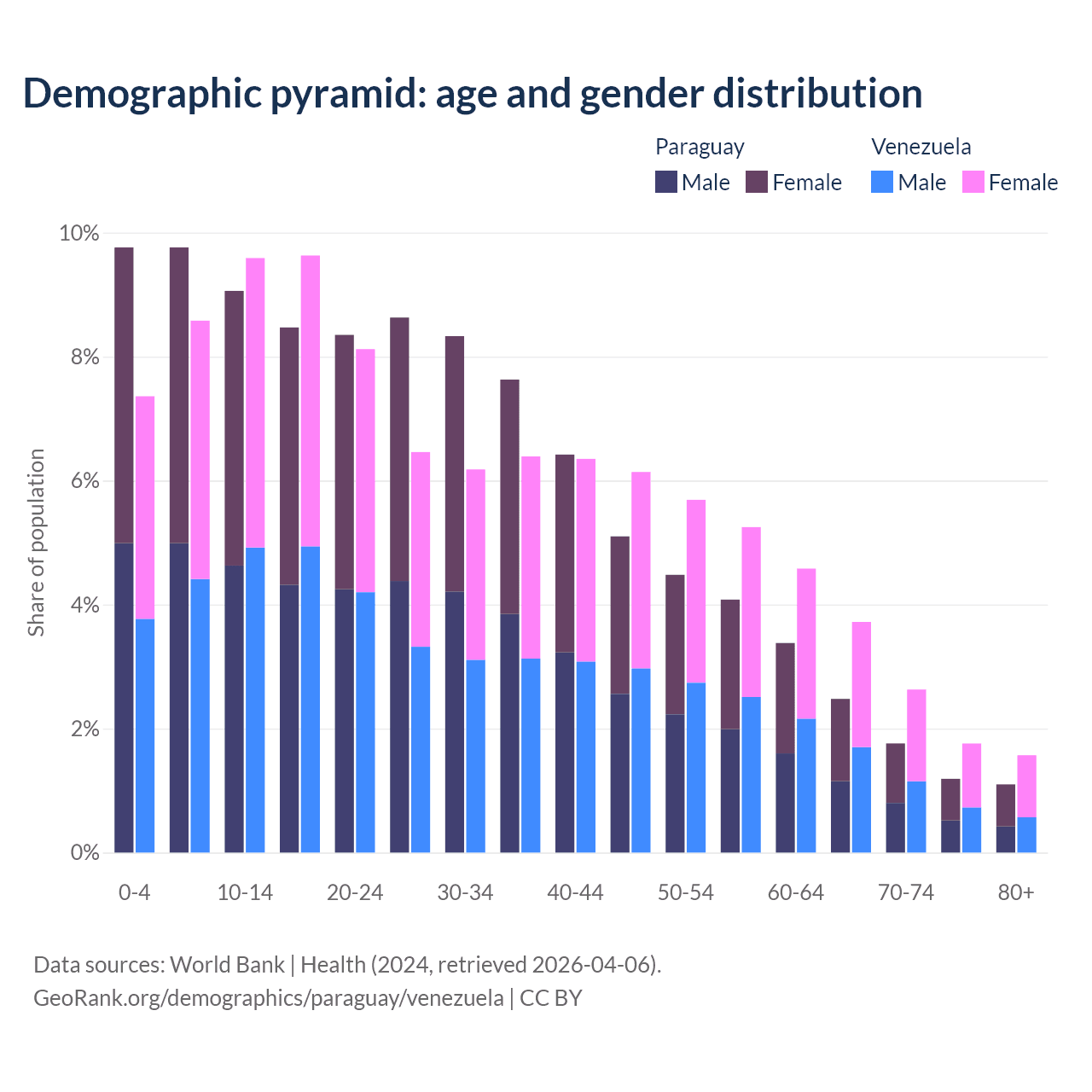 - The share of old-age demographic (65+) in Paraguay is 6.54% vs 9.68% in Venezuela.