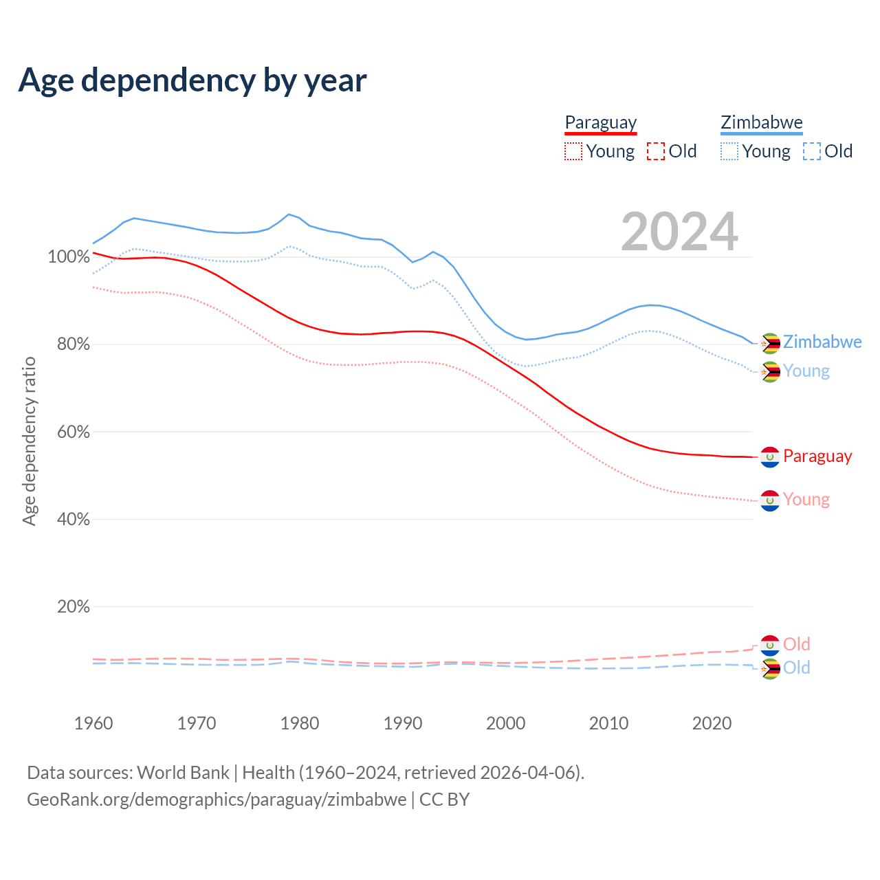The share of older people aged 65 and over is 6.54% in Paraguay and 3.6% in Zimbabwe. Life expectancy in Paraguay compared to Zimbabwe .