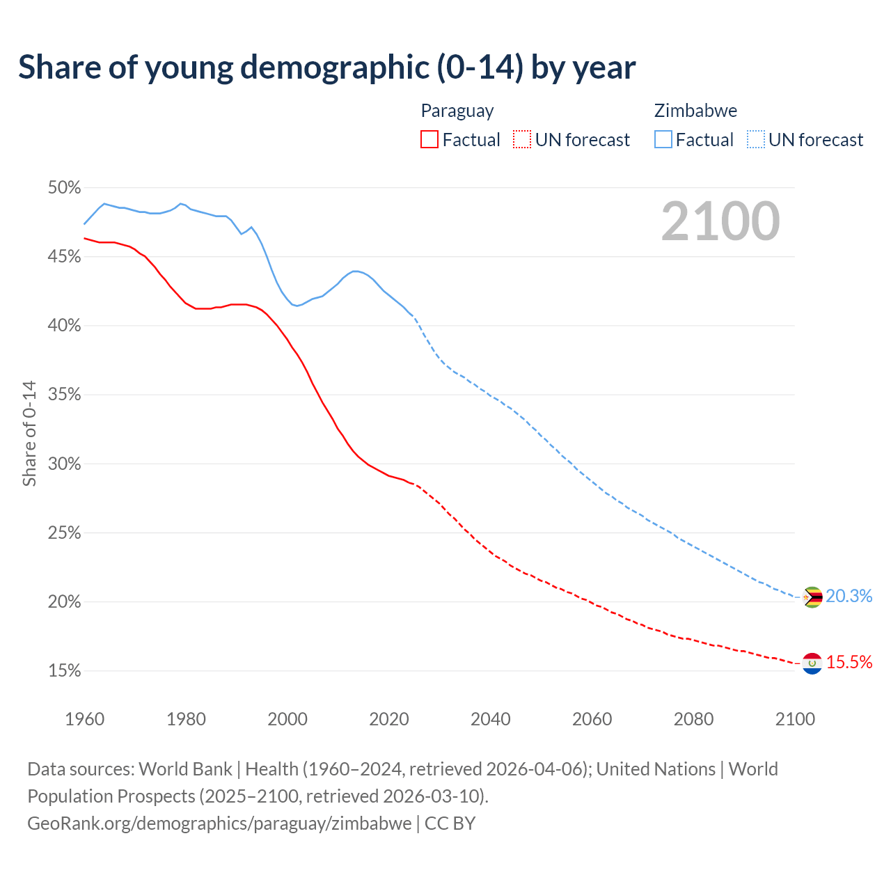 - The share of young demographic (0-15 years old) in Paraguay is 28.6% vs 40.9% in Zimbabwe.
