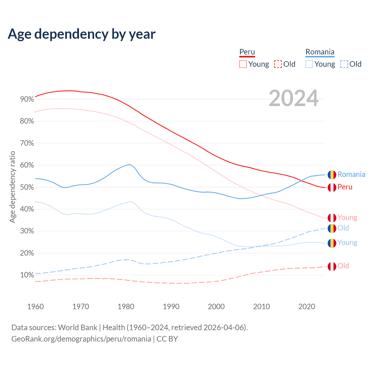- Peru is ranked 97/196 by median age (oldest to youngest) vs 23/196 for Romania.