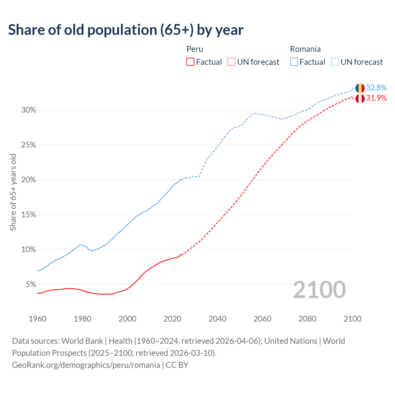 The share of older people aged 65 and over is 9.23% in Peru and 20% in Romania. Life expectancy in Peru compared to Romania .