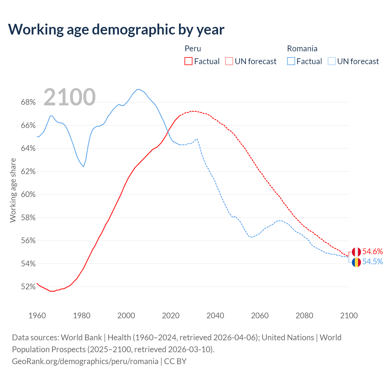 - Peru has 23.4M working age adults (aged 15-64) vs 12.1M in Romania.