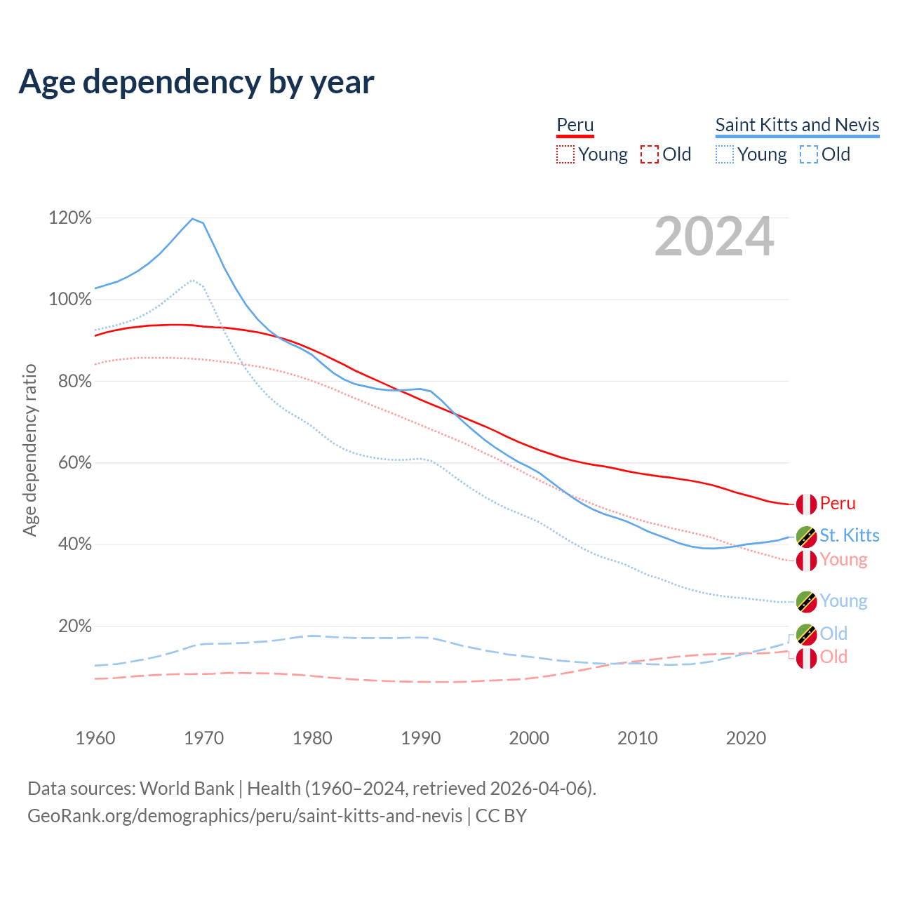 - The share of young demographic (0-15 years old) in Peru is 24% vs 18.2% in Saint Kitts and Nevis.