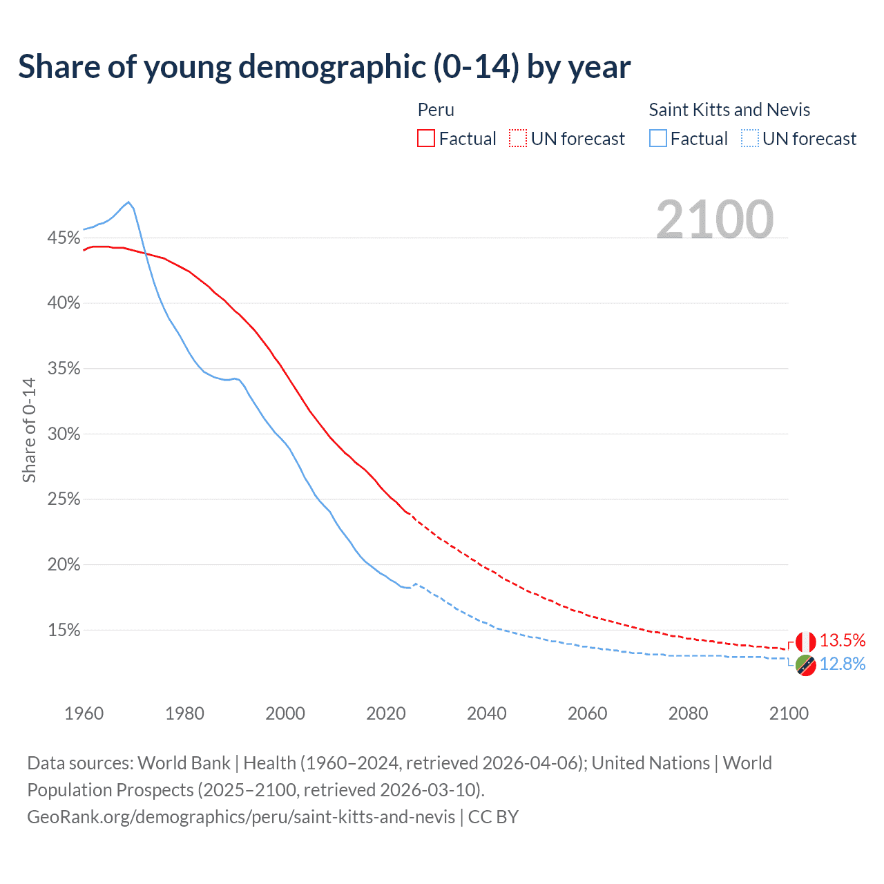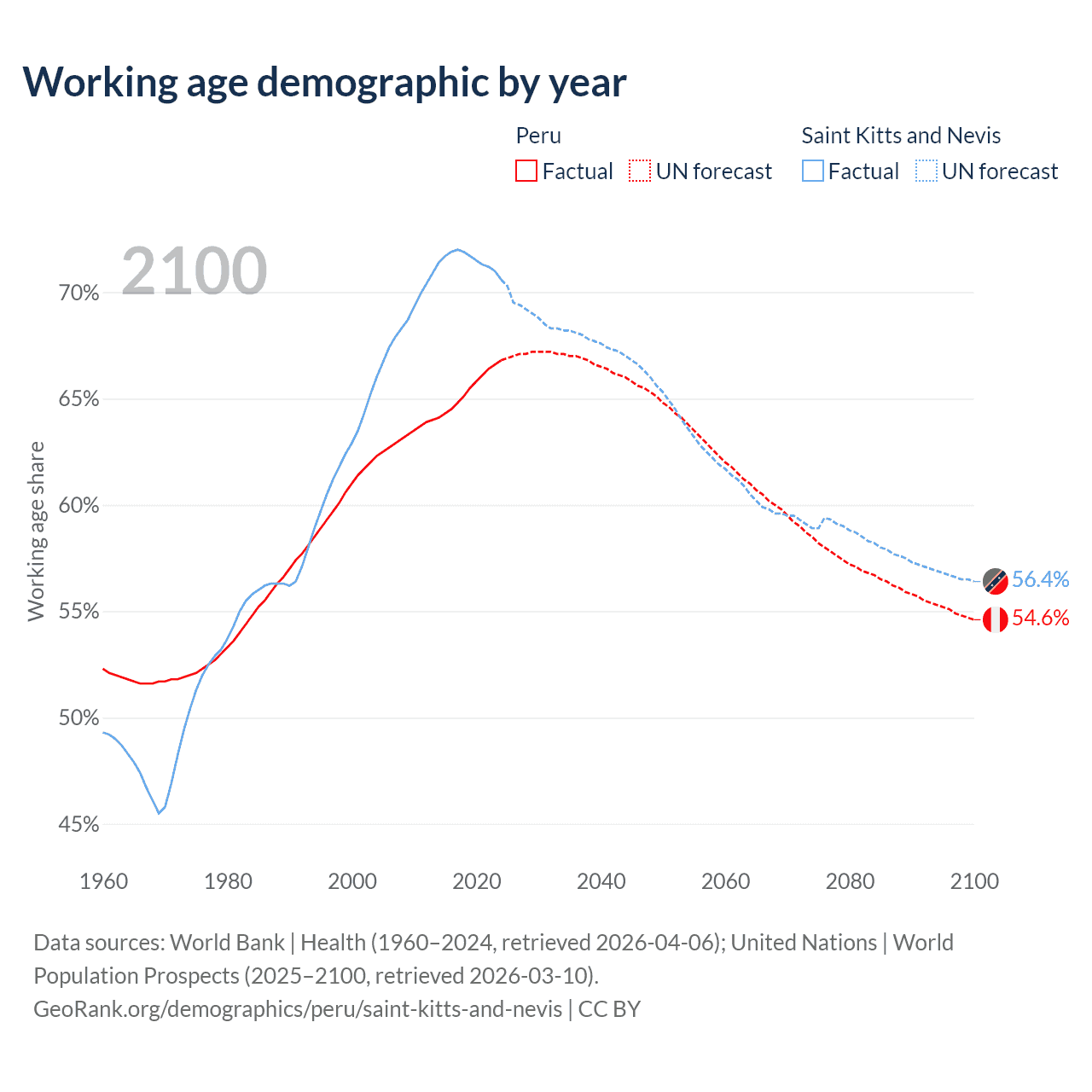 Median age Peru vs Saint Kitts and Nevis, 1960-2100