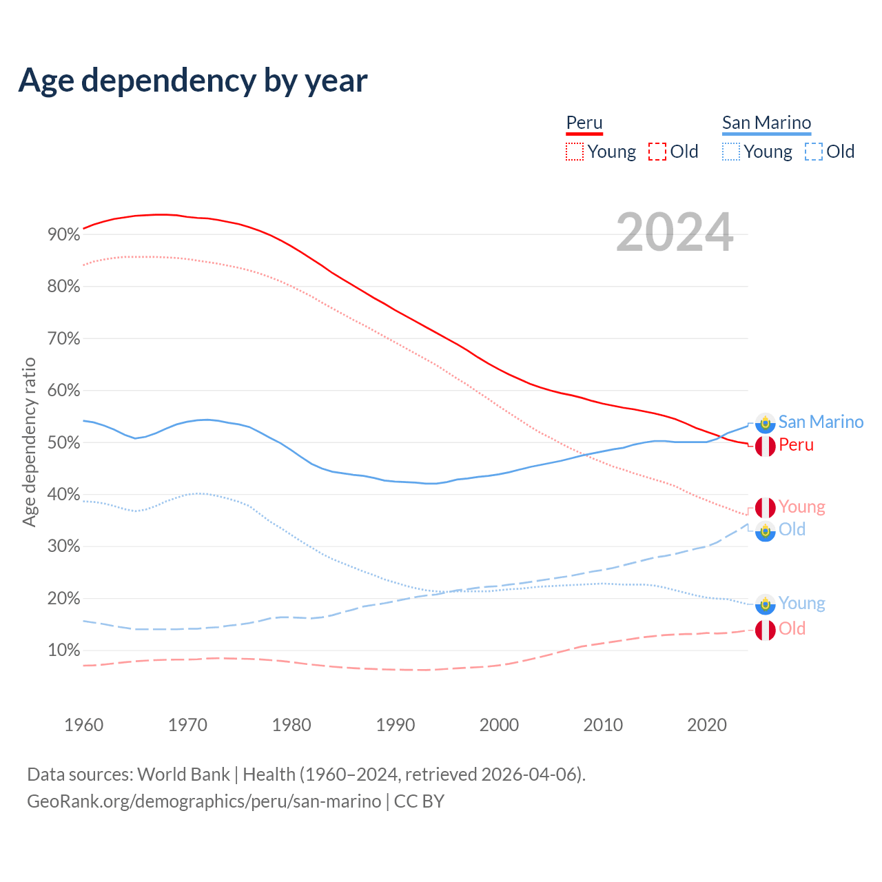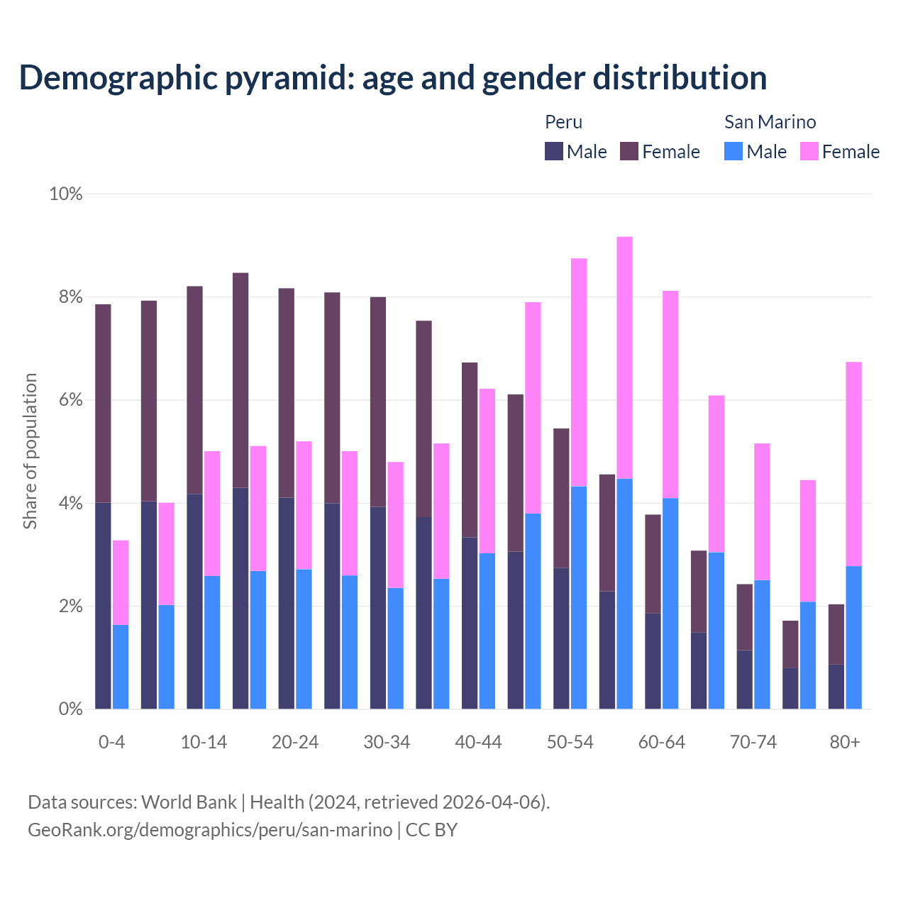 - Peru is ranked 97/196 by median age (oldest to youngest) vs 3/196 for San Marino.