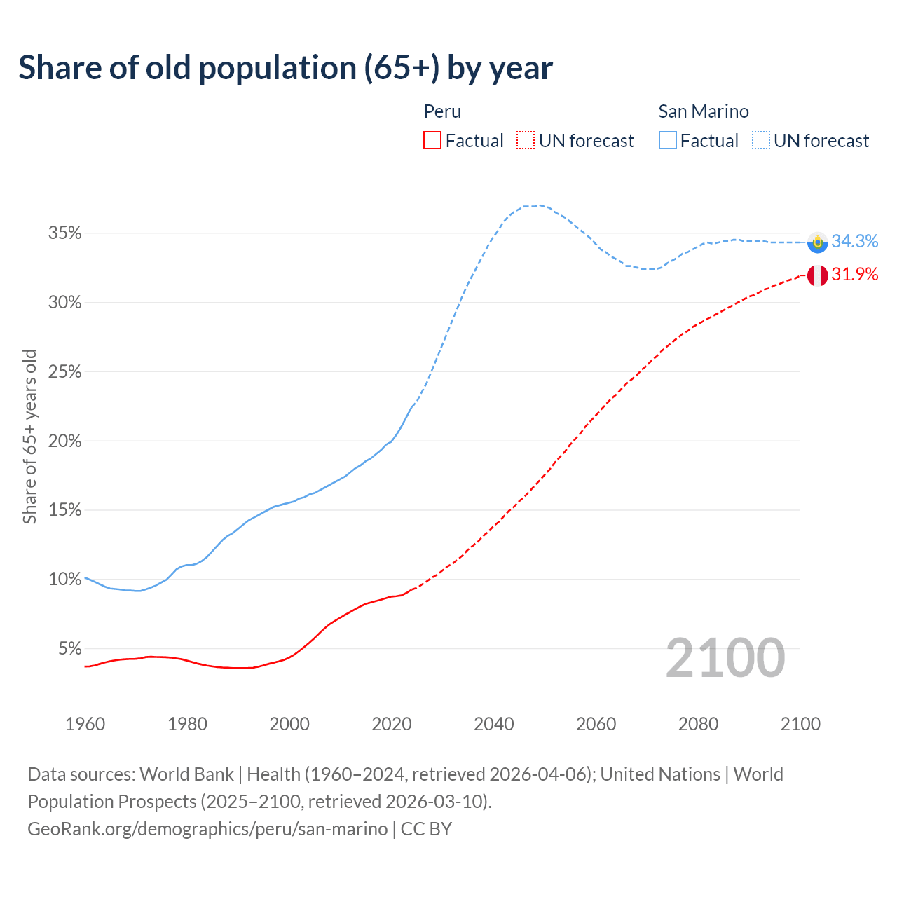 - The share of old-age demographic (65+) in Peru is 9.23% vs 22.4% in San Marino.