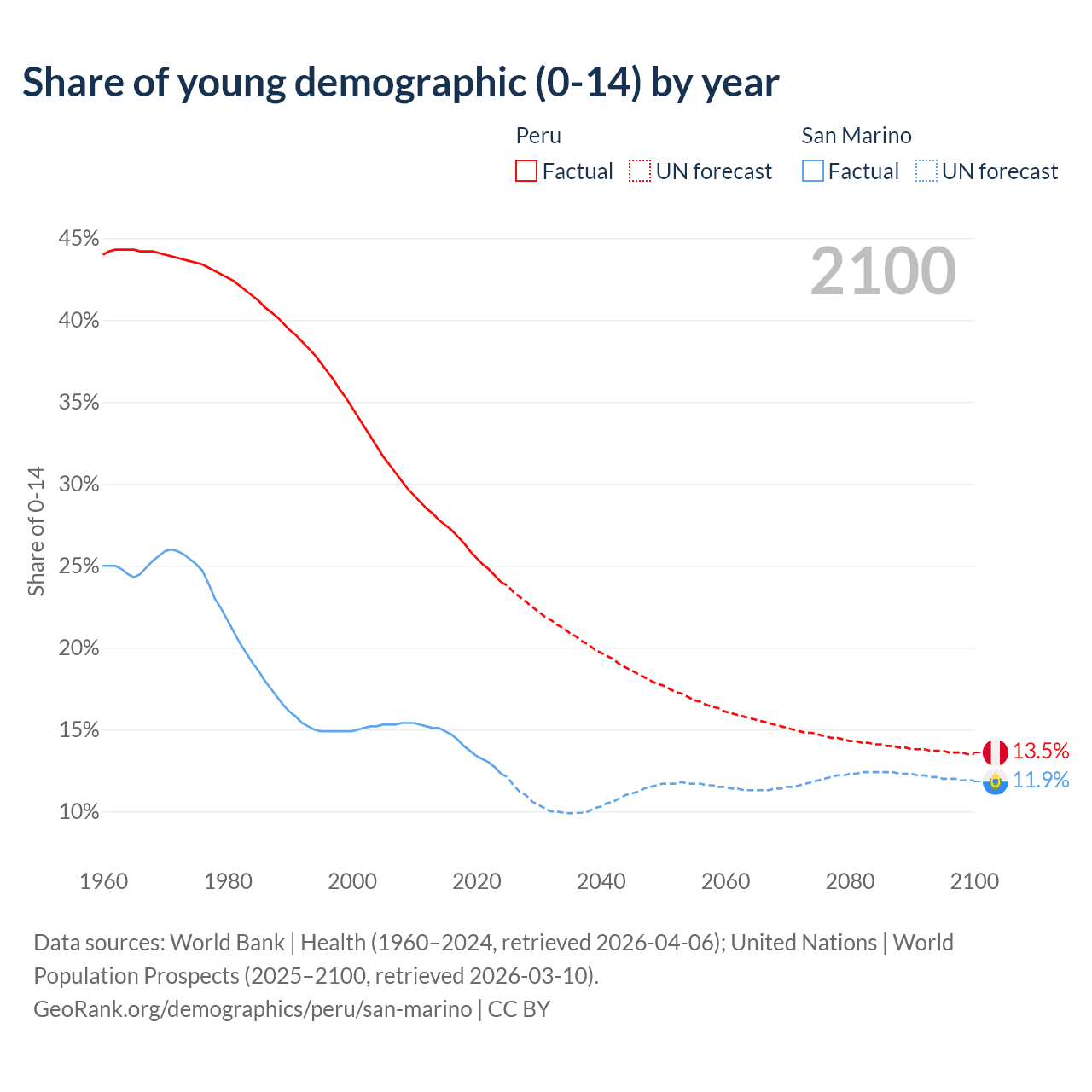 - The share of young demographic (0-15 years old) in Peru is 24% vs 12.3% in San Marino.