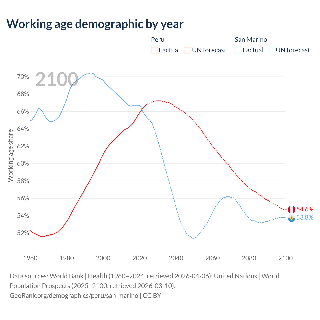 - Peru has 23.4M working age adults (aged 15-64) vs 22.2K in San Marino.