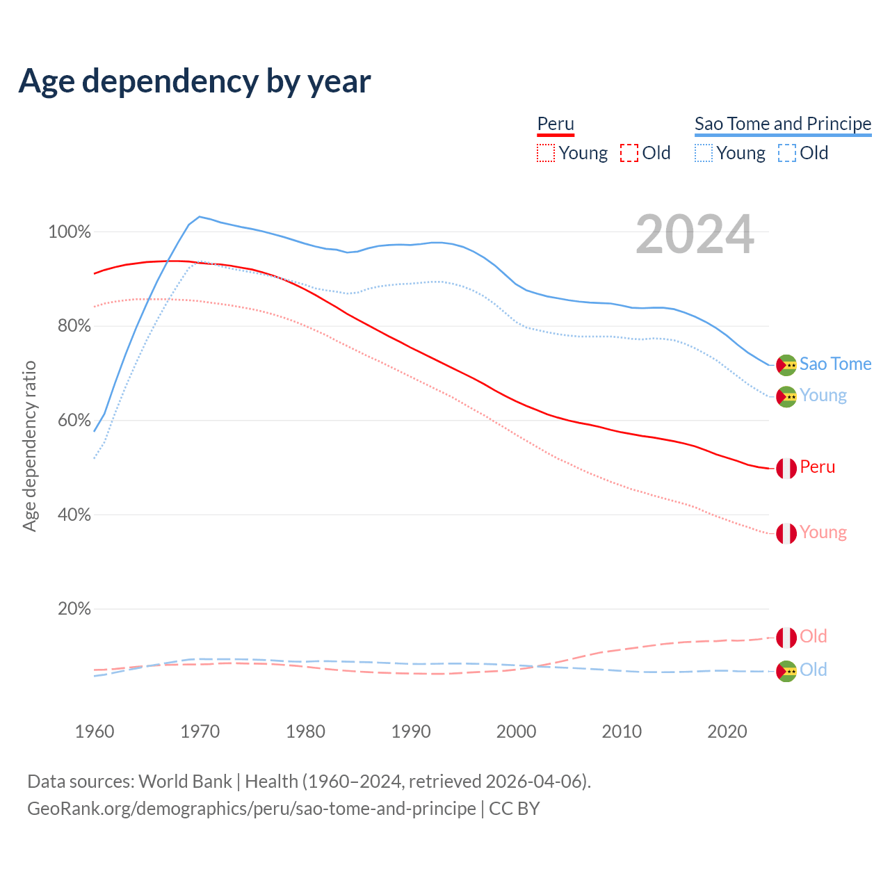 - The share of young demographic (0-15 years old) in Peru is 24% vs 37.8% in Sao Tome and Principe.