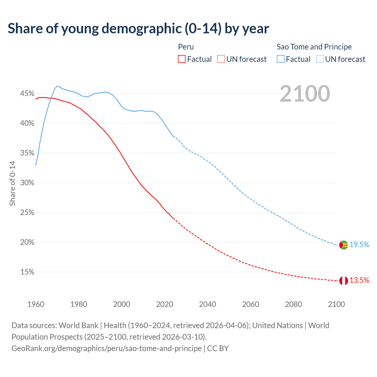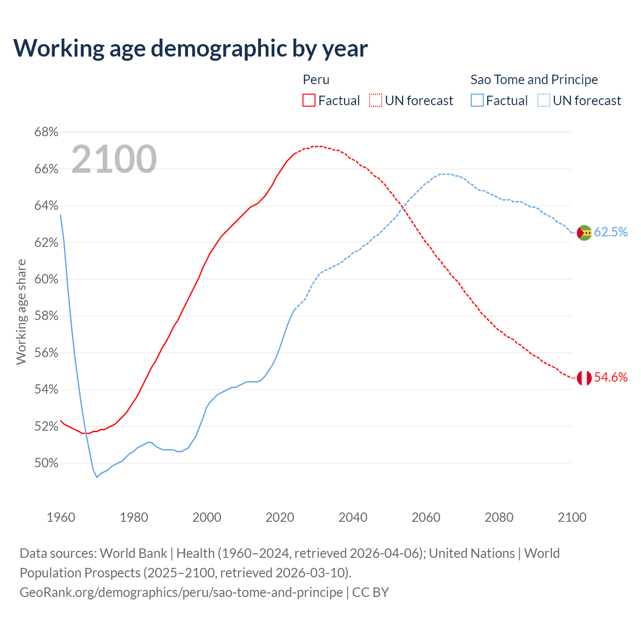 Median age Peru vs Sao Tome and Principe, 1960-2100