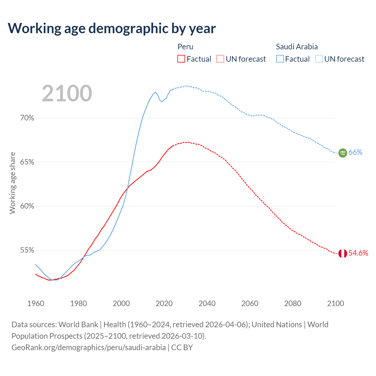 Median age Peru vs Saudi Arabia, 1960-2100