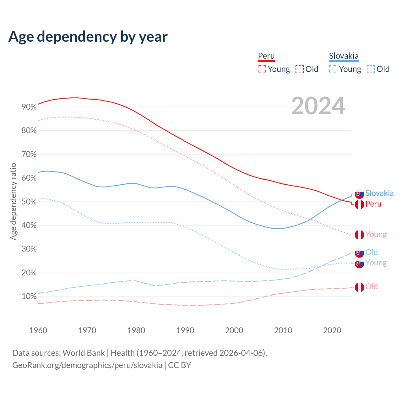 - Peru is ranked 97/196 by median age (oldest to youngest) vs 31/196 for Slovakia.