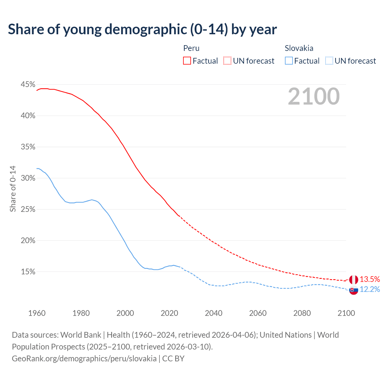 - The share of young demographic (0-15 years old) in Peru is 24% vs 15.8% in Slovakia.